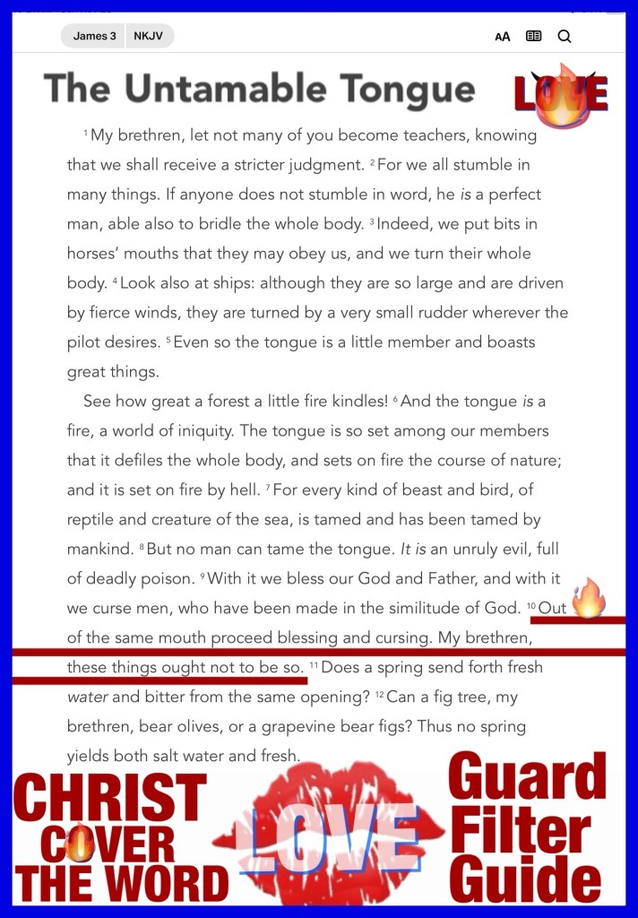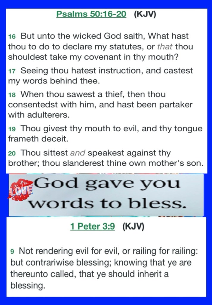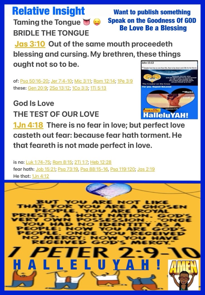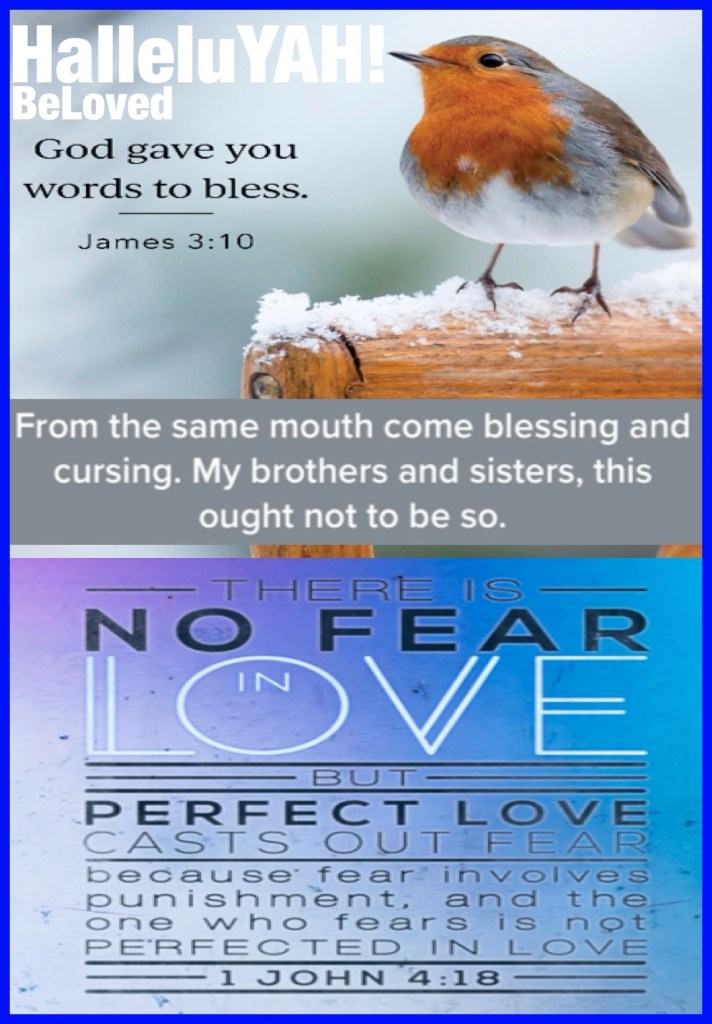 “Out of the same mouth proceed blessing and cursing. My brethren, these things ought not to be so.” James 3:10 “There is no fear in love; but perfect love casts out fear, because fear involves torment. But he who fears has not been made perfect in love.” I John 4:18