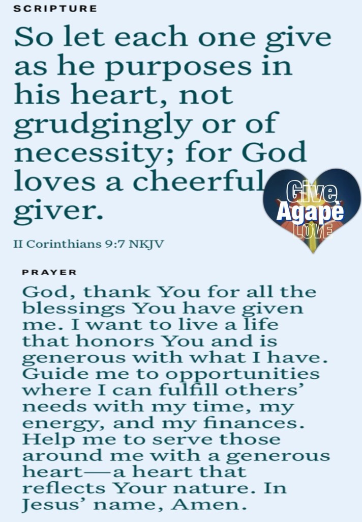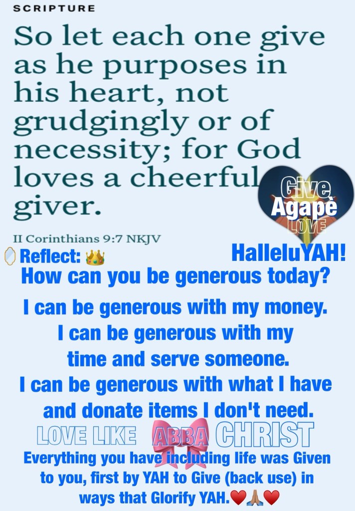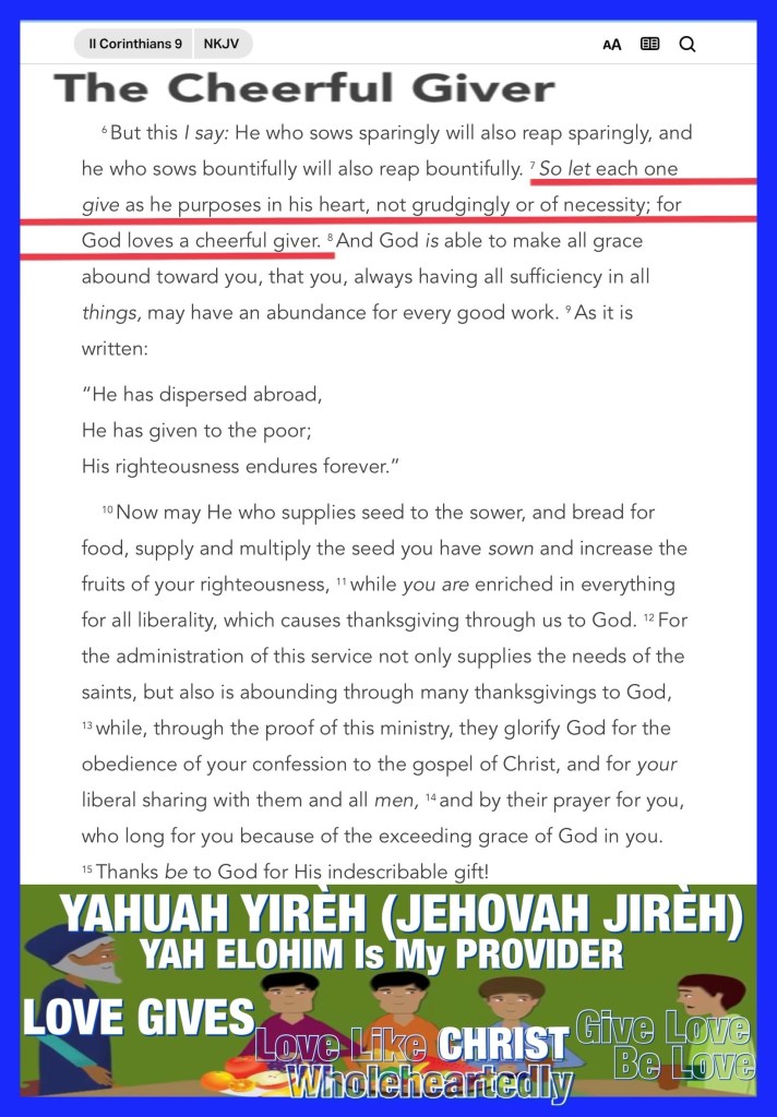 The Original Cheerful Giver Is our FATHER SAVIOR GOD Who Is LOVE CHARITY TRUTH PEACE And More!… when we adopt The Spirit of Giving we operate In one of The Fruits Of THE HOLY SPIRIT and in so doing we look a little more like our Heavenly FATHER YAH. That said in life we are given various blessings: experiences: gifts that are life defining they shape us and CHRIST Himself uses them for our good; this is still true of seemingly horrible situations the reality is YAH blesses and the enemy works to turn that into a curse, which is why JESUS (YAH) encourages us saying ♥️“But I have prayed for you, that your faith should not fail; and when you have returned to Me, strengthen your brethren.”” Luke 22:32 2 Corinthians 8:12 For if there be first a willing mind, it is accepted according to that a man hath, and not according to that he hath not.