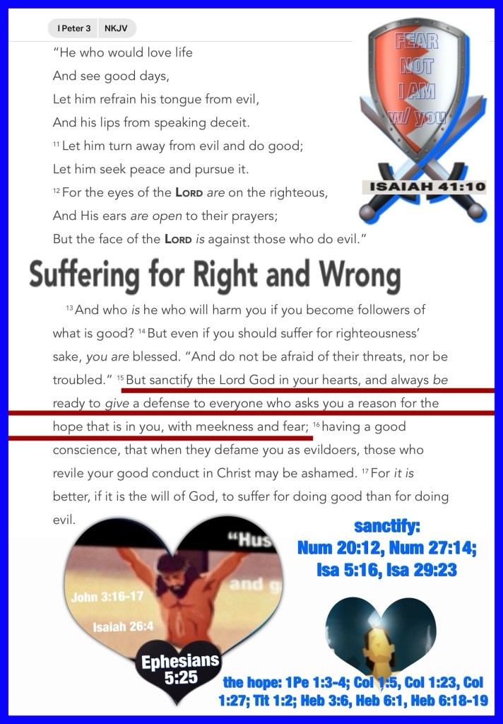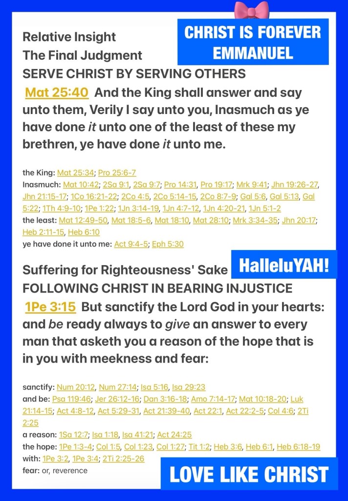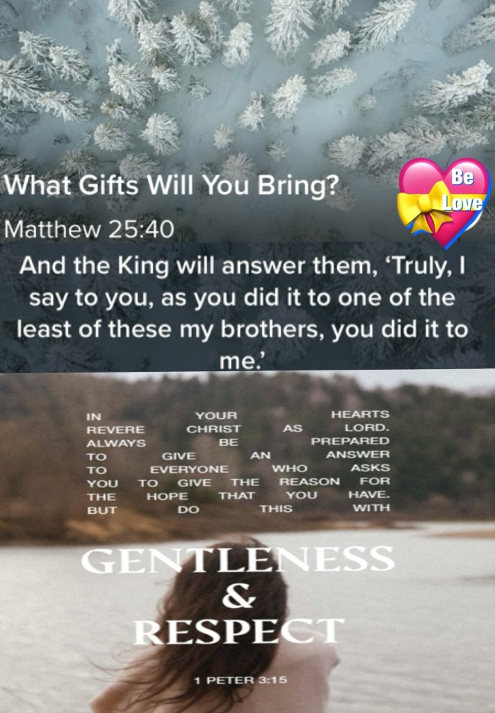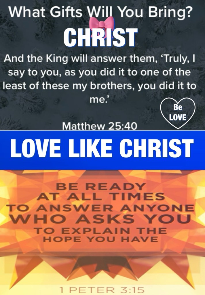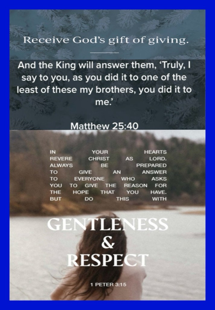 “And the King will answer and say to them, ‘Assuredly, I say to you, inasmuch as you did it to one of the least of these My brethren, you did it to Me.’” Matthew 25:40 “But sanctify the Lord God in your hearts, and always be ready to give a defense to everyone who asks you a reason for the hope that is in you, with meekness and fear;” I Peter 3:15