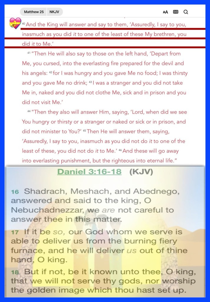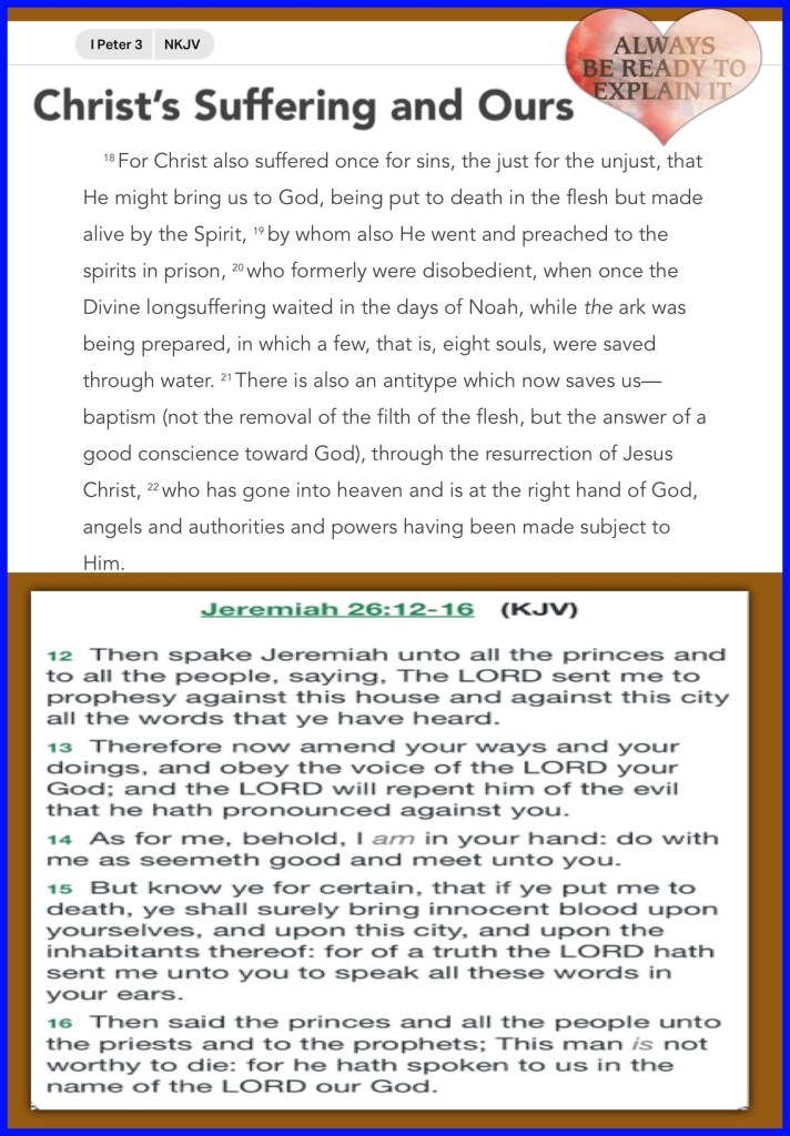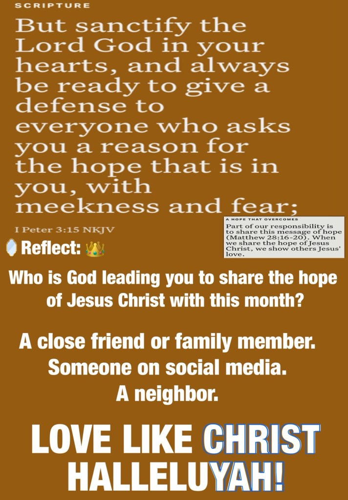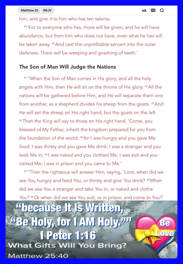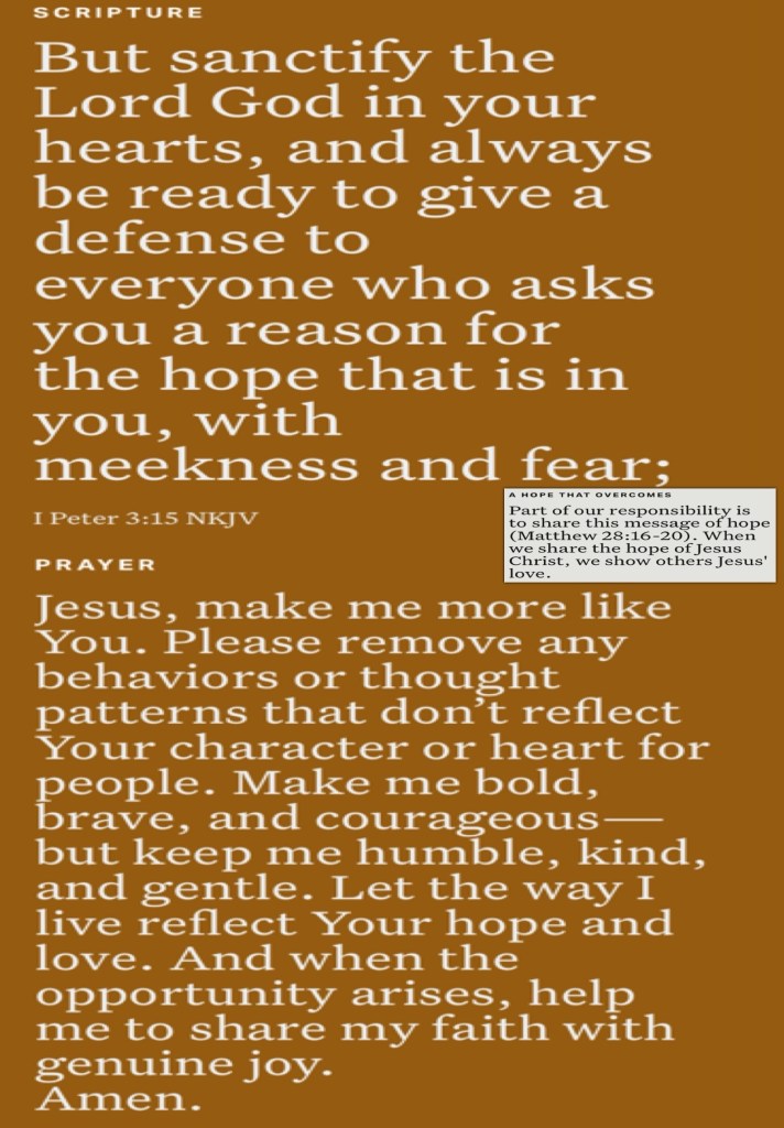 “And the King will answer and say to them, ‘Assuredly, I say to you, inasmuch as you did it to one of the least of these My brethren, you did it to Me.’” Matthew 25:40 “But sanctify the Lord God in your hearts, and always be ready to give a defense to everyone who asks you a reason for the hope that is in you, with meekness and fear;” I Peter 3:15