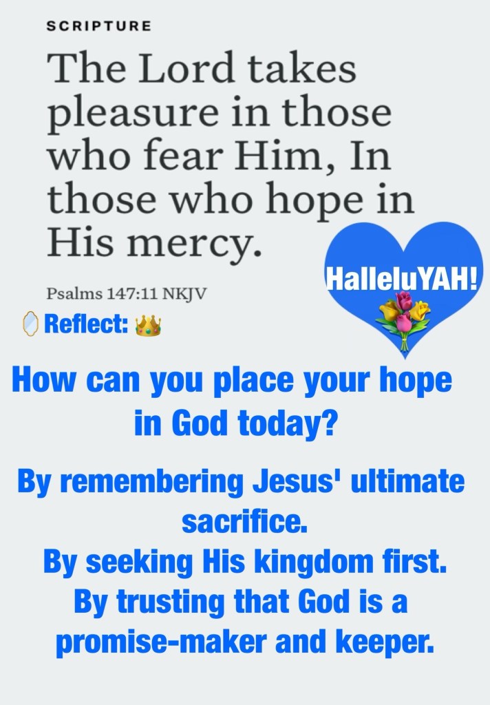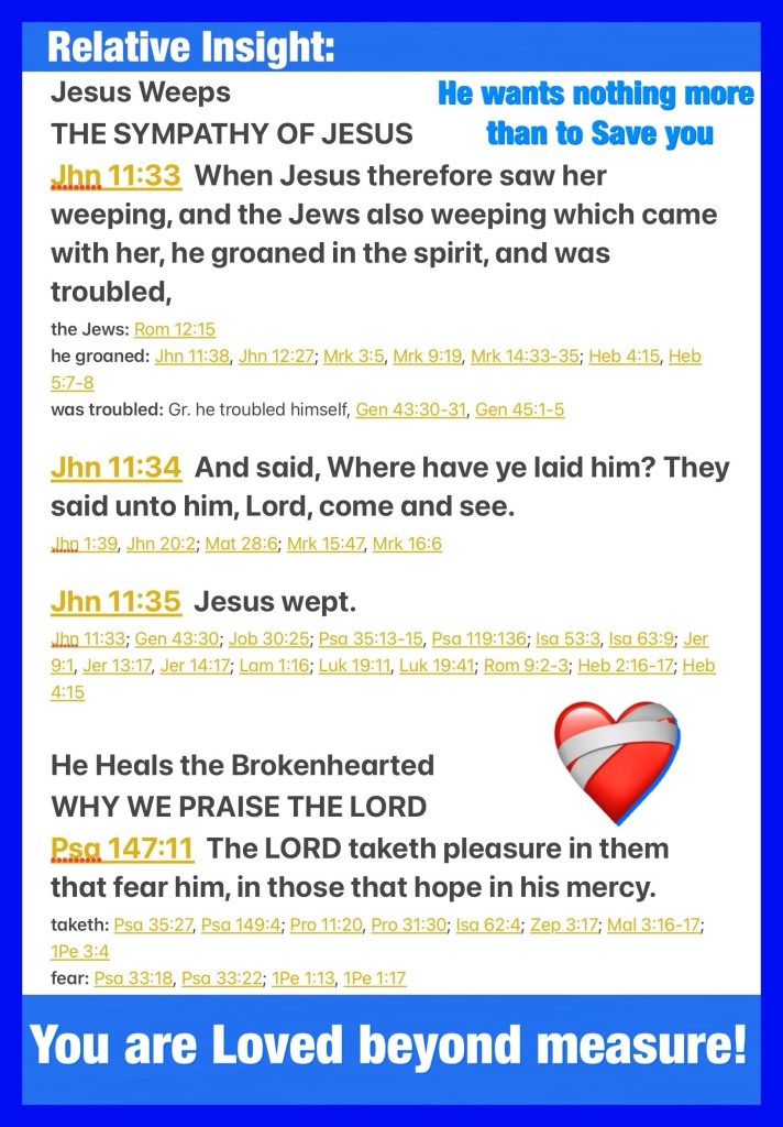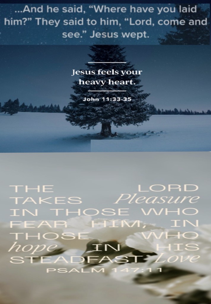 “Therefore, when Jesus saw her weeping, and the Jews who came with her weeping, He groaned in the spirit and was troubled. And He said, “Where have you laid him?” They said to Him, “Lord, come and see.” Jesus wept.” John 11:33-35 “The Lord takes pleasure in those who fear Him, In those who hope in His mercy.” Psalms 147:11
