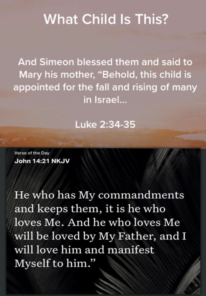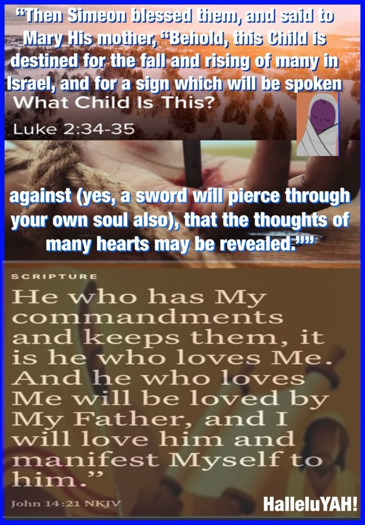 “Then Simeon blessed them, and said to Mary His mother, “Behold, this Child is destined for the fall and rising of many in Israel, and for a sign which will be spoken against (yes, a sword will pierce through your own soul also), that the thoughts of many hearts may be revealed.”” Luke 2:34-35 “He who has My commandments and keeps them, it is he who loves Me. And he who loves Me will be loved by My Father, and I will love him and manifest Myself to him.”” John 14:21