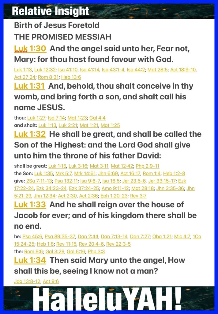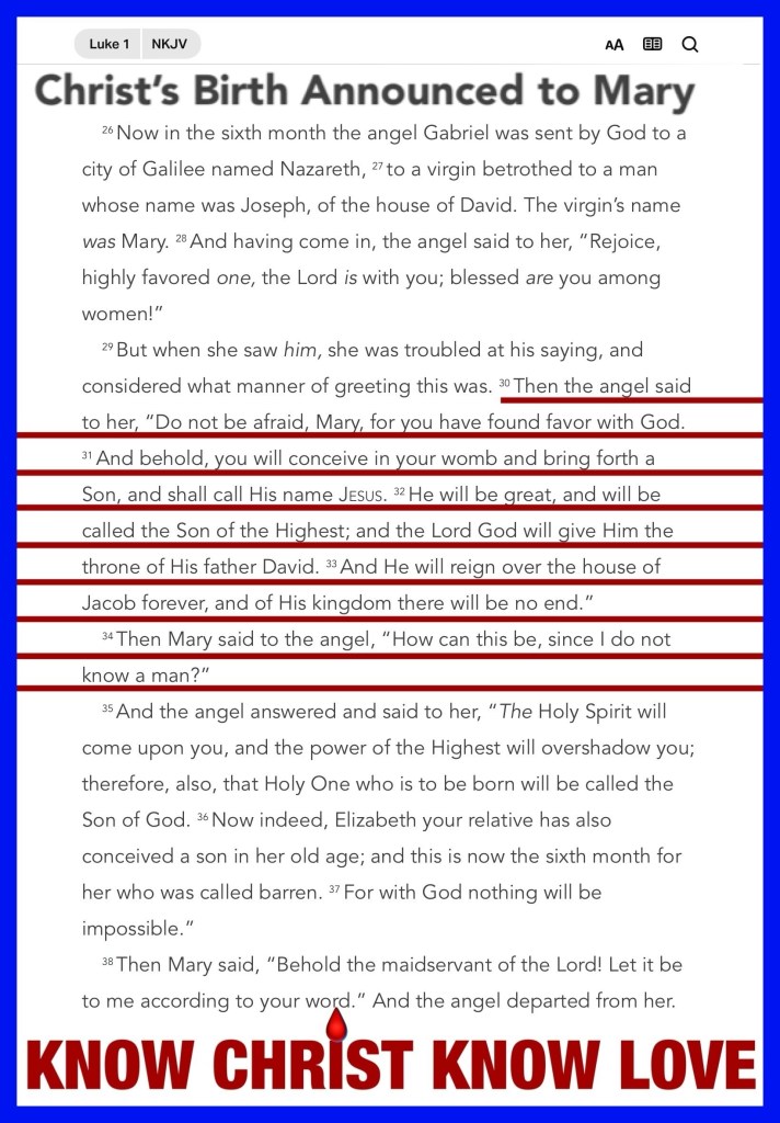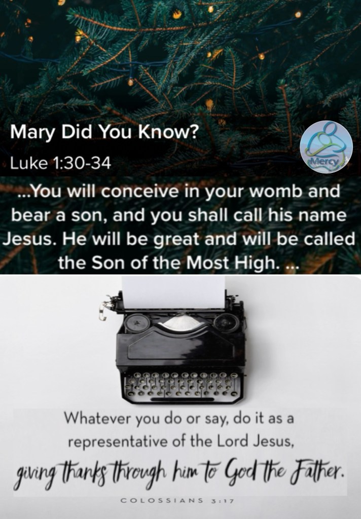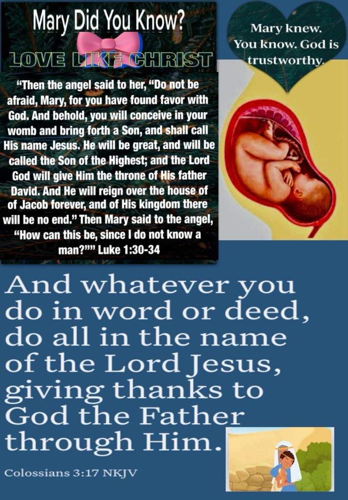 “Then the angel said to her, “Do not be afraid, Mary, for you have found favor with God. And behold, you will conceive in your womb and bring forth a Son, and shall call His name Jesus. He will be great, and will be called the Son of the Highest; and the Lord God will give Him the throne of His father David. And He will reign over the house of Jacob forever, and of His kingdom there will be no end.” Then Mary said to the angel, “How can this be, since I do not know a man?”” Luke 1:30-34 “And whatever you do in word or deed, do all in the name of the Lord Jesus, giving thanks to God the Father through Him.” Colossians 3:17
