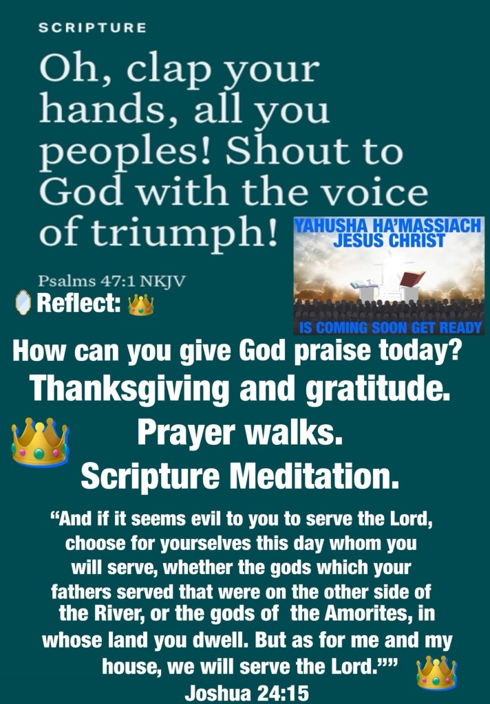 “And Mary said: “My soul magnifies the Lord, And my spirit has rejoiced in God my Savior. For He has regarded the lowly state of His maidservant; For behold, henceforth all generations will call me blessed. For He who is mighty has done great things for me, And holy is His name. And His mercy is on those who fear Him From generation to generation. He has shown strength with His arm; He has scattered the proud in the imagination of their hearts. He has put down the mighty from their thrones, And exalted the lowly. He has filled the hungry with good things, And the rich He has sent away empty. He has helped His servant Israel, In remembrance of His mercy, As He spoke to our fathers, To Abraham and to his seed forever.” And Mary remained with her about three months, and returned to her house.” Luke 1:46-56 “Oh, clap your hands, all you peoples! Shout to God with the voice of triumph!” Psalms 47:1 👑YHWH IS KING over All the Earth HalleluYAH! GOD IS Our Fortress Magnify His Holy Name with me! HalleluYAH! He Is our FATHER And CREATOR And Worthy Of All Praise! 🙌 Psalms 98:4 Make a joyful noise unto the LORD, all the earth: make a loud noise, and rejoice, and sing praise.