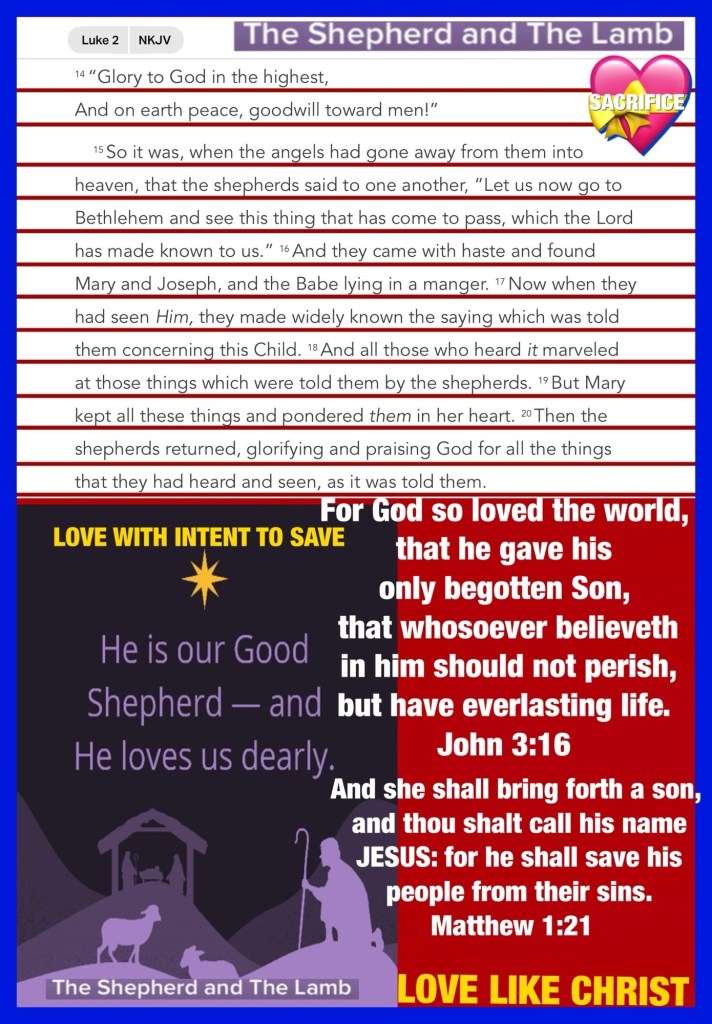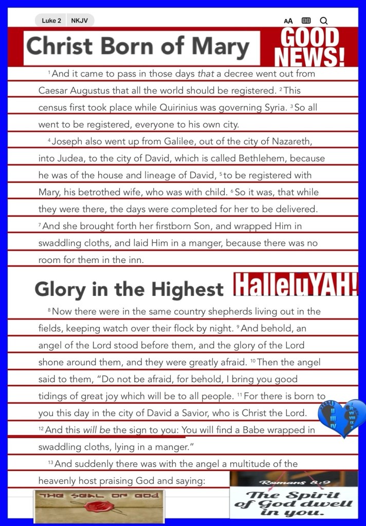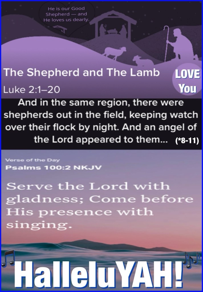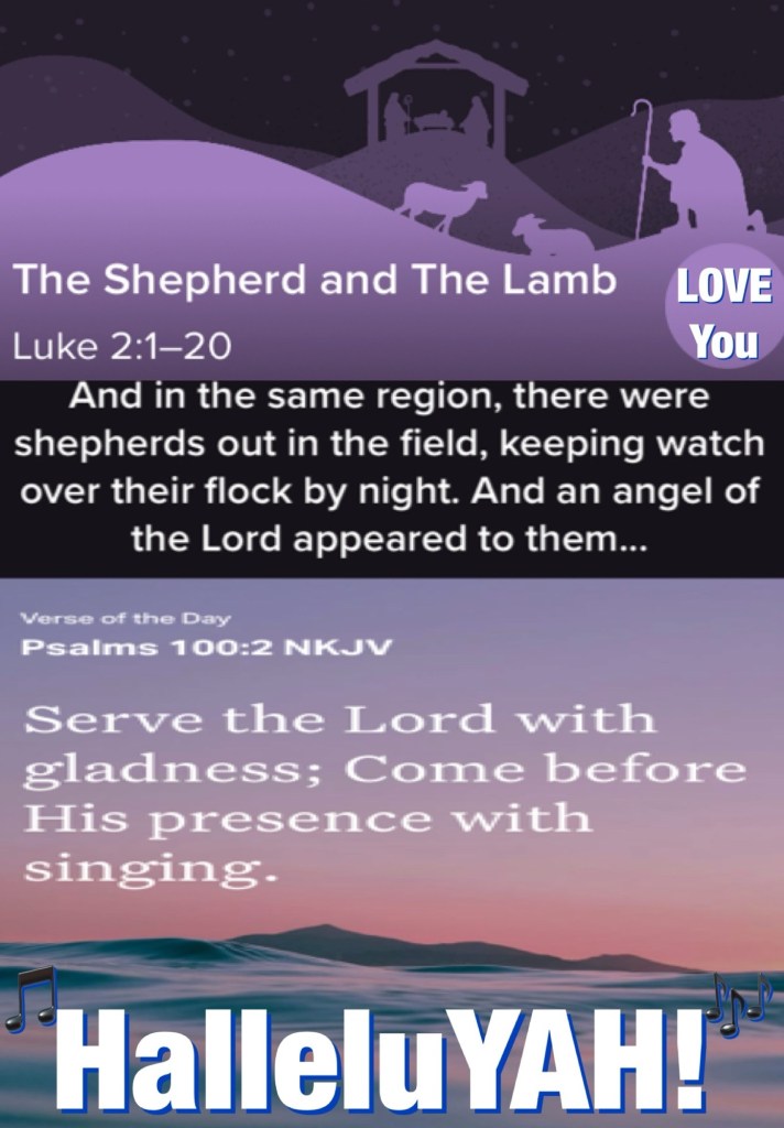 “And it came to be in those days that a decree went out from Caesar Augustus for all the world to be registered. This took place as a first registration while Quirinius was governing Suria. And all were going to be registered, each one to his own city. And Yosĕph also went up from Galil, out of the city of Natsareth to Yehuḏah, to the city of Dawiḏ, which is called Bĕyth Leḥem, because he was of the house and lineage of Dawiḏ, to be registered with Miryam, who was engaged to him – being pregnant. And it came to be, that while they were there, the days were filled for her to give birth. And she gave birth to her first-born Son, and wrapped Him up, and laid Him down in a feeding trough, because there was no room for them in a lodging place. And in the same country there were shepherds living out in the fields, keeping watch over their flock by night. And look, a messenger of יהוה stood before them, and the esteem of יהוה shone around them, and they were greatly afraid. And the messenger said to them, “Do not be afraid, for look, I bring you good news of great joy which shall be to all people. “Because there was born to you today in the city of Dawiḏ a Saviour, who is Messiah, the Master. “And this is the sign to you: You shall find a baby wrapped up, lying in a feeding trough.” And suddenly there was with the messenger a crowd of the heavenly host praising Elohim and saying, Esteem to Elohim in the highest, and on earth peace among men with whom He is pleased! And it came to be, when the messengers had gone away from them into the heaven, that the shepherds said to each other, “Indeed, let us go to Bĕyth Leḥem and see this matter that has taken place, which the Master has made known to us.” And they came in haste and found Miryam and Yosĕph, and the baby lying in a feeding trough. And having seen, they made known the matter which was spoken to them concerning the child. And all those who heard marvelled at what the shepherds said to them. But Miryam kept all these matters, considering them in her heart. And the shepherds returned, boasting and praising Elohim for all they had heard and seen, as it was spoken to them.”Luqas (Luke) 2:1-20 TS2009 👑 “Serve יהוה with gladness; Come before His presence with singing.” Tehillim (Psalms) 100:2 TS2009 🎶 🎵