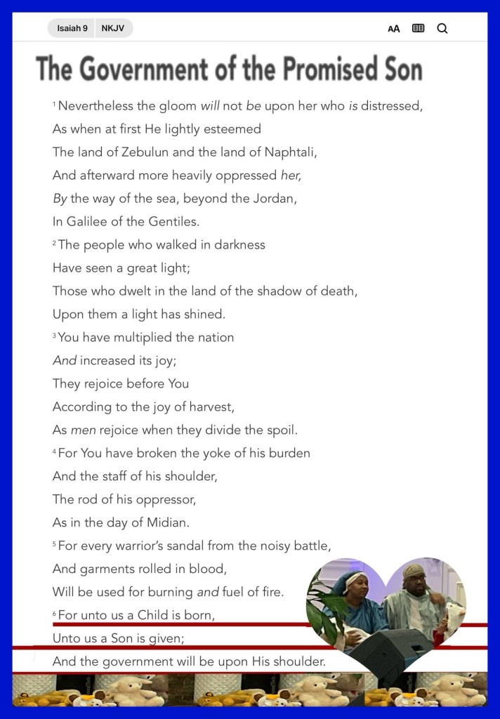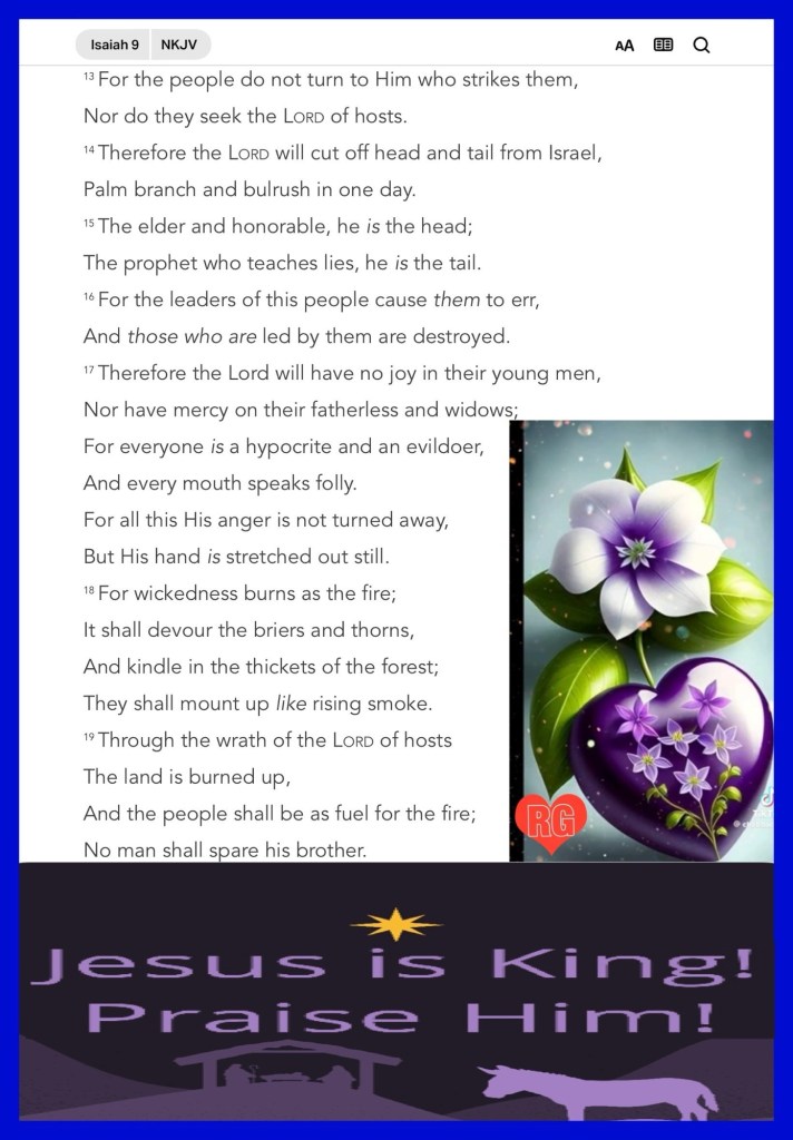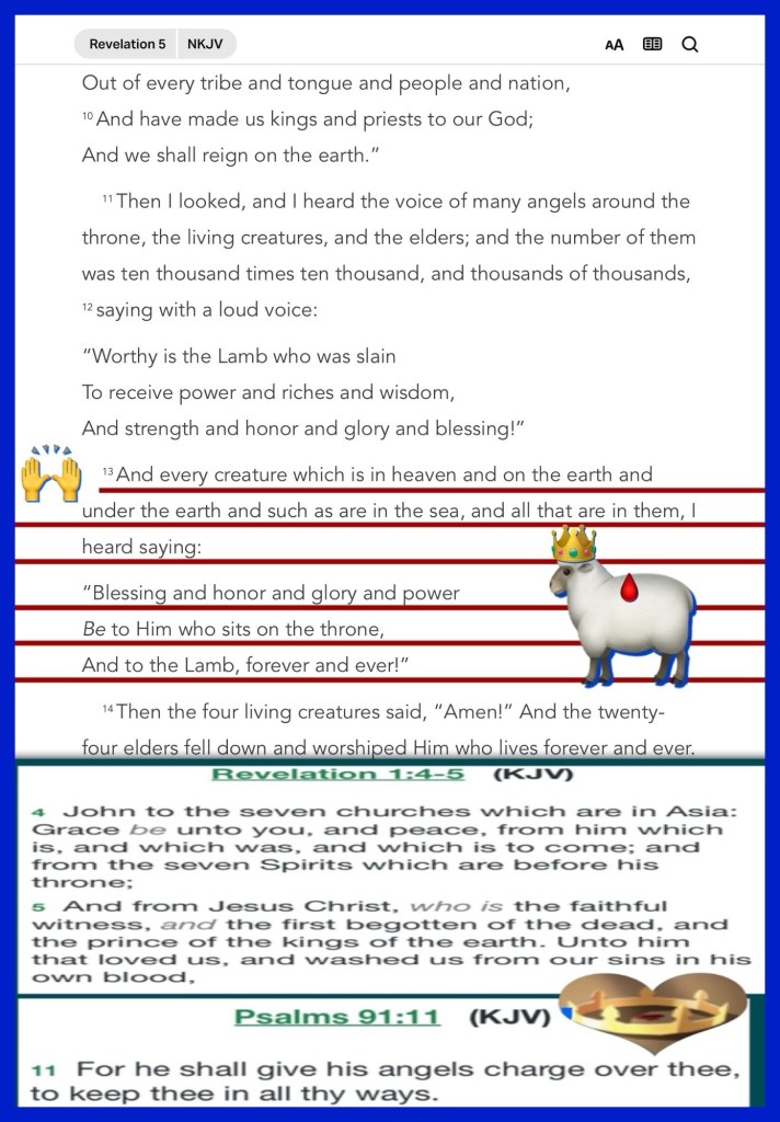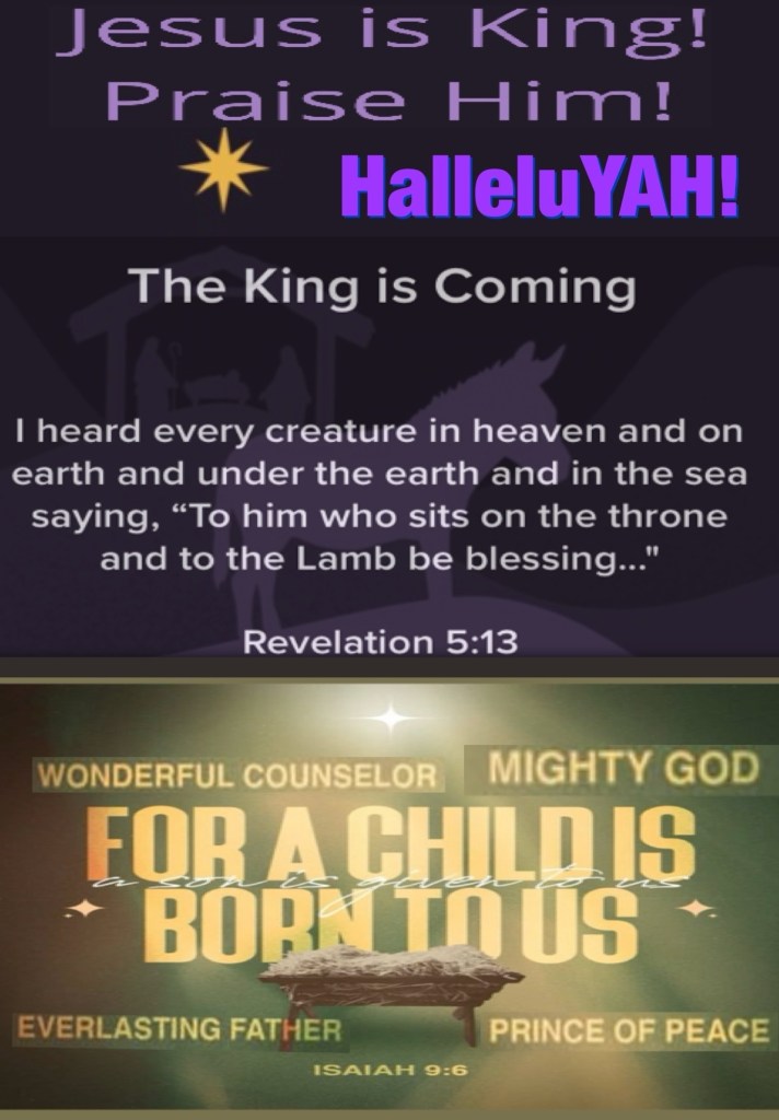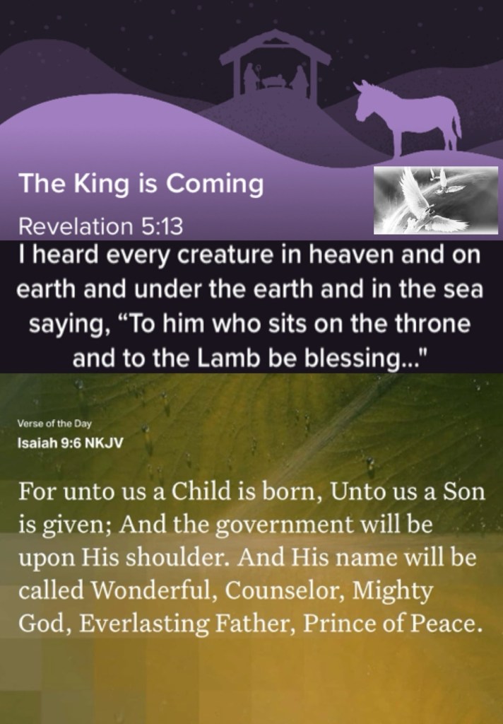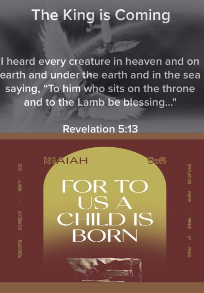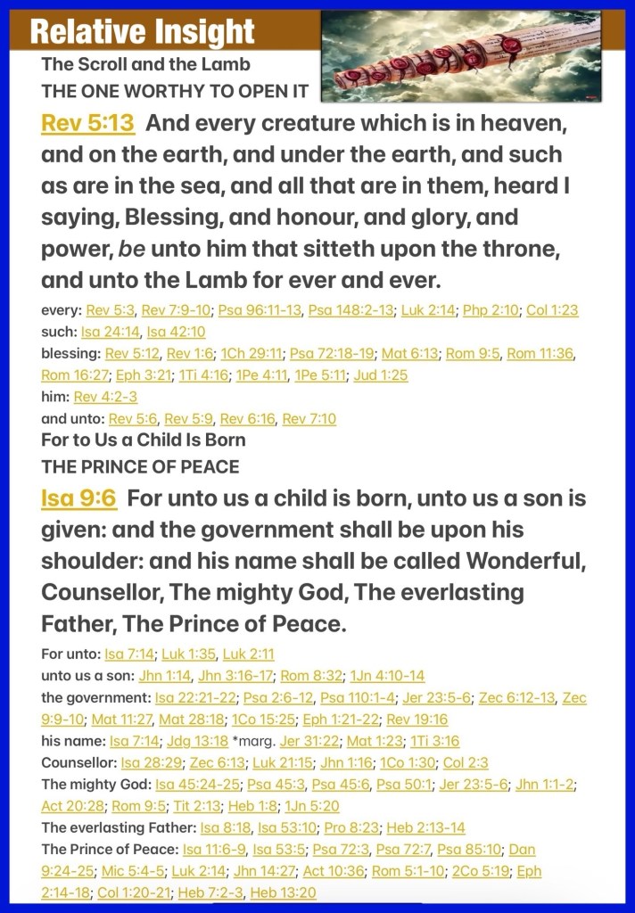 “And every creature which is in heaven and on the earth and under the earth and such as are in the sea, and all that are in them, I heard saying: “Blessing and honor and glory and power Be to Him who sits on the throne, And to the Lamb, forever and ever!”” Revelation 5:13 “For unto us a Child is born, Unto us a Son is given; And the government will be upon His shoulder. And His name will be called Wonderful, Counselor, Mighty God, Everlasting Father, Prince of Peace.” Isaiah 9:6