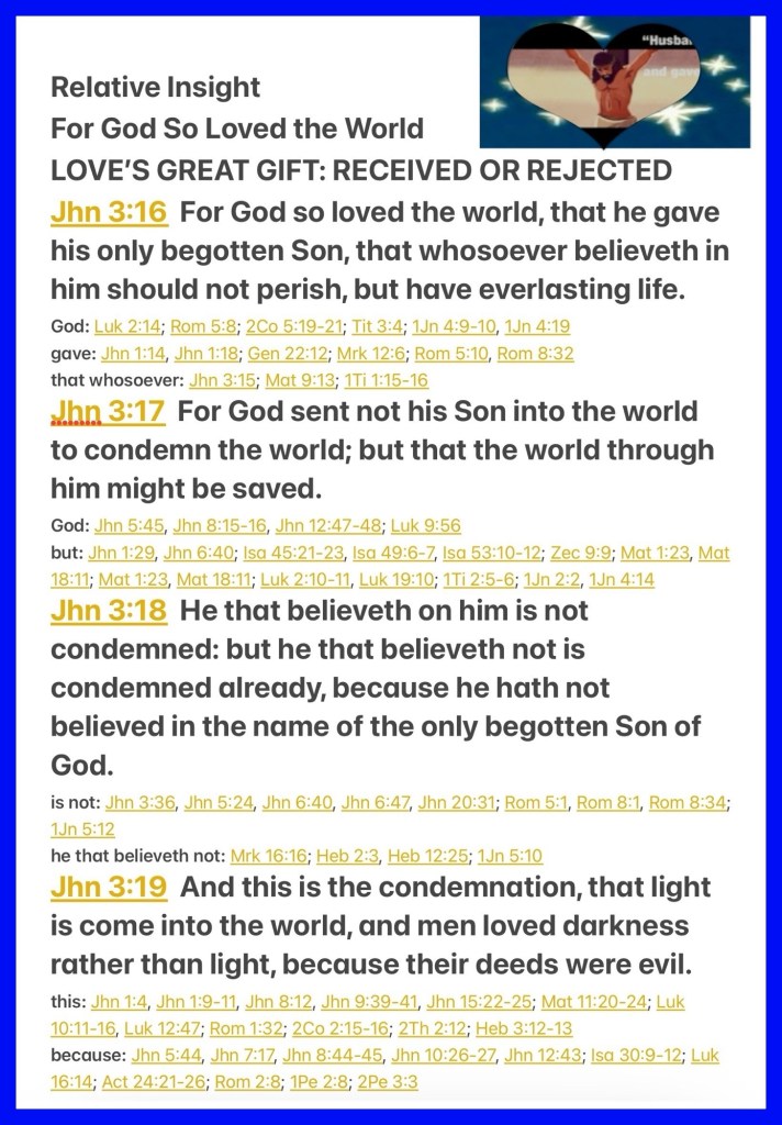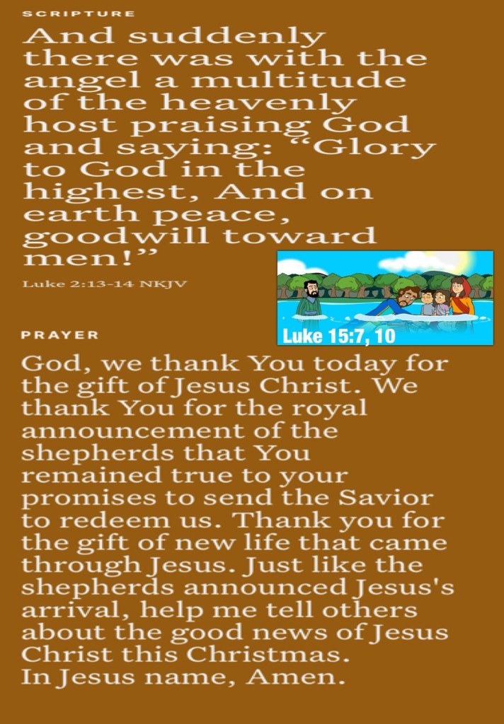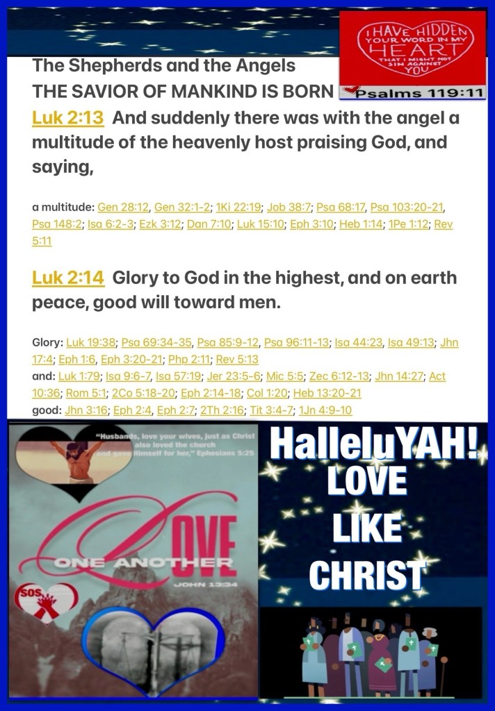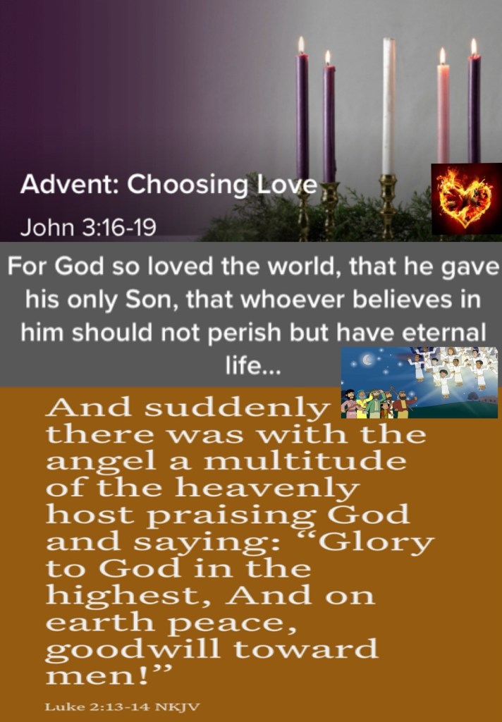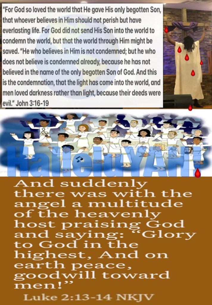 “For God so loved the world that He gave His only begotten Son, that whoever believes in Him should not perish but have everlasting life. For God did not send His Son into the world to condemn the world, but that the world through Him might be saved. “He who believes in Him is not condemned; but he who does not believe is condemned already, because he has not believed in the name of the only begotten Son of God. And this is the condemnation, that the light has come into the world, and men loved darkness rather than light, because their deeds were evil.” John 3:16-19 “And suddenly there was with the angel a multitude of the heavenly host praising God and saying: “Glory to God in the highest, And on earth peace, goodwill toward men!”” Luke 2:13-14