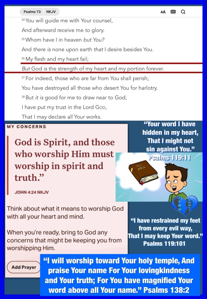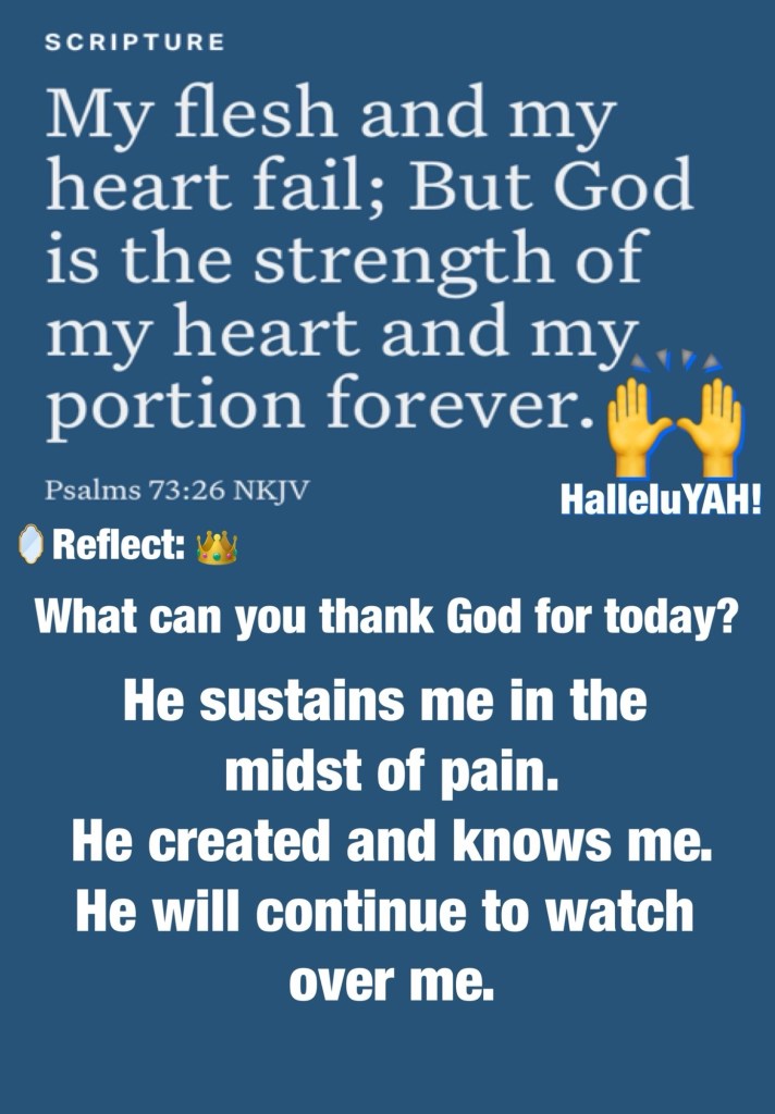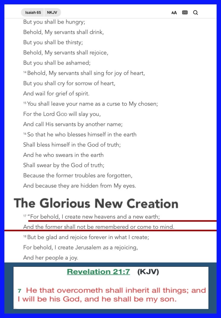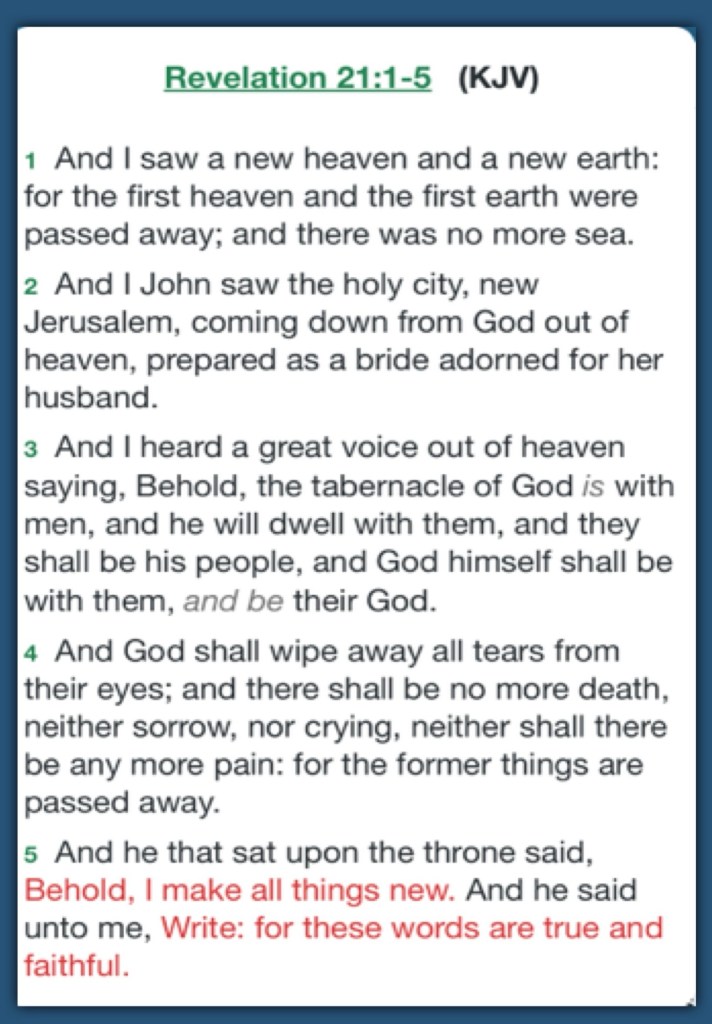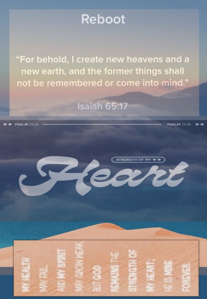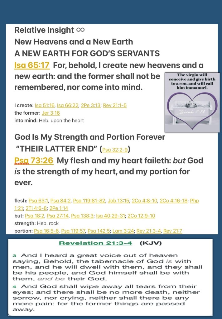 ““For behold, I create new heavens and a new earth; And the former shall not be remembered or come to mind.” Isaiah 65:17 “My flesh and my heart fail; But God is the strength of my heart and my portion forever.” Psalms 73:26