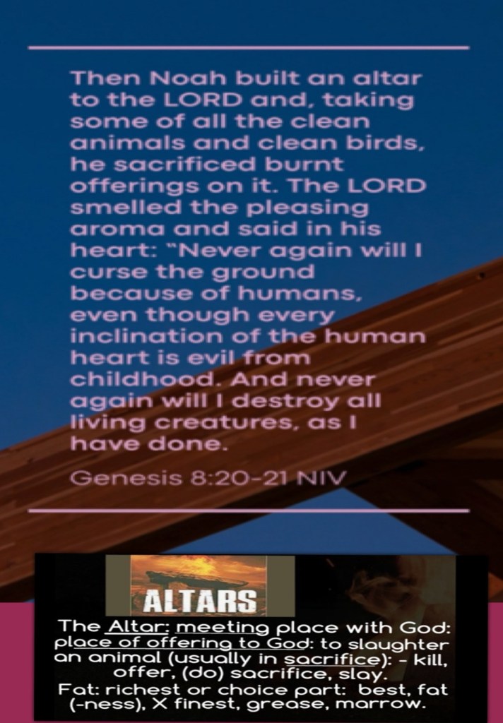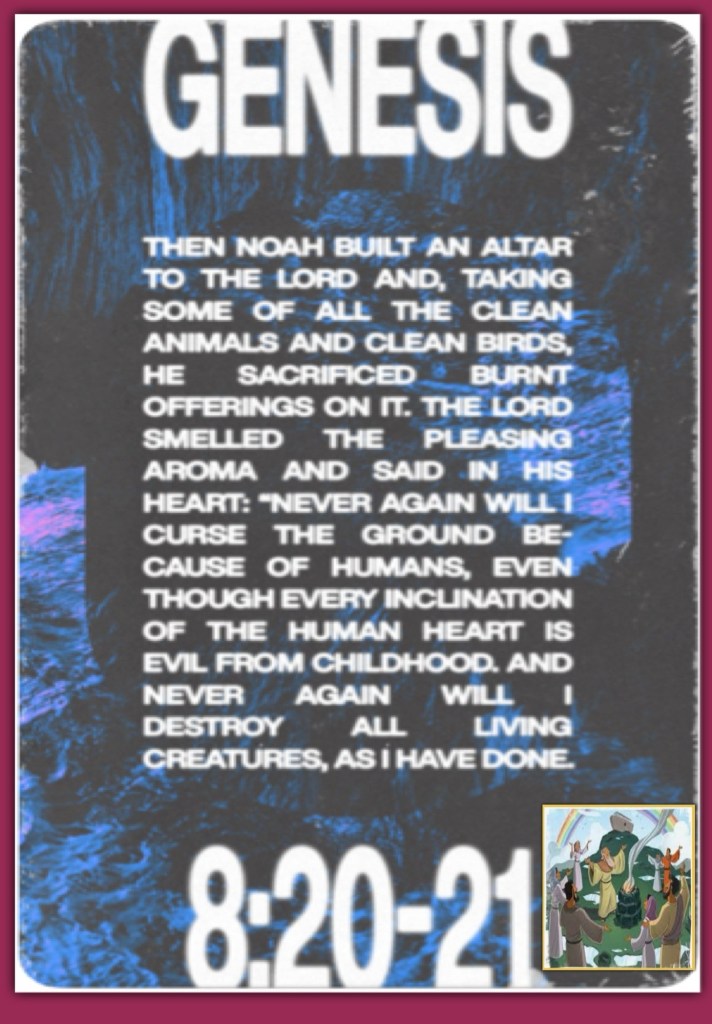 “Then Noah built an altar to the Lord, and took of every clean animal and of every clean bird, and offered burnt offerings on the altar. And the Lord smelled a soothing aroma. Then the Lord said in His heart, “I will never again curse the ground for man’s sake, although the imagination of man’s heart is evil from his youth; nor will I again destroy every living thing as I have done.” Genesis 8:20-21