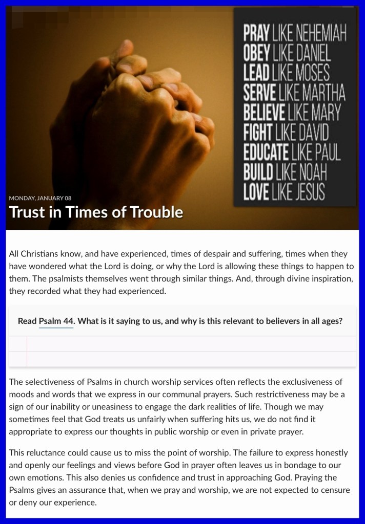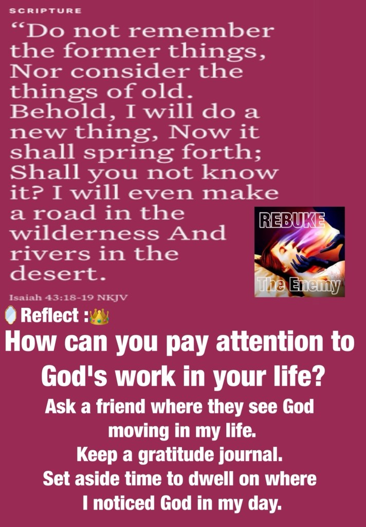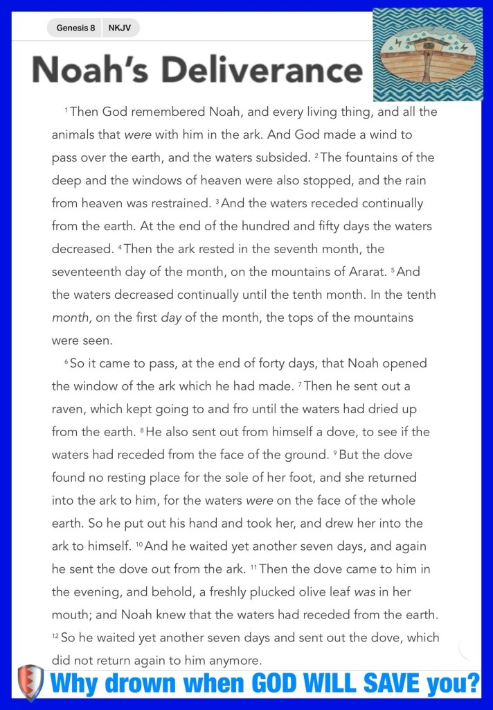 Today’s study: Genesis 8, Today’s Verses: “These things I have spoken to you, that in Me you may have peace. In the world you will have tribulation; but be of good cheer, I have overcome the world.”” John 16:33 ““Do not remember the former things, Nor consider the things of old. Behold, I will do a new thing, Now it shall spring forth; Shall you not know it? I will even make a road in the wilderness And rivers in the desert.” Isaiah 43:18-19