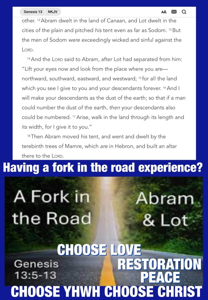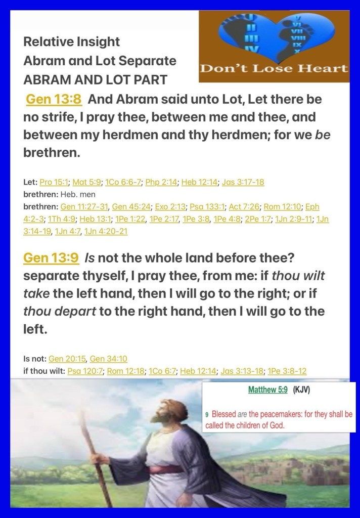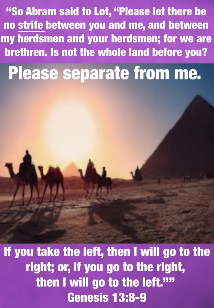“So Abram said to Lot, “Please let there be no strife between you and me, and between my herdsmen and your herdsmen; for we are brethren. Is not the whole land before you? Please separate from me. If you take the left, then I will go to the right; or, if you go to the right, then I will go to the left.”” Genesis 13:8-9