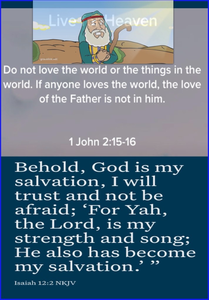 Isaiah 57:15 For thus saith the high and lofty One that inhabiteth eternity, whose name is Holy; I dwell in the high and holy place, with him also that is of a contrite and humble spirit, to revive the spirit of the humble, and to revive the heart of the contrite ones. Today’s study: Genesis 14, Today’s Verses: “Do not love the world or the things in the world. If anyone loves the world, the love of the Father is not in him. For all that is in the world—the lust of the flesh, the lust of the eyes, and the pride of life—is not of the Father but is of the world.” I John 2:15-16 “Behold, God is my salvation, I will trust and not be afraid; ‘For YAH, The Lord, is my strength and song; He also has become my salvation.’ ”” Isaiah 12:2