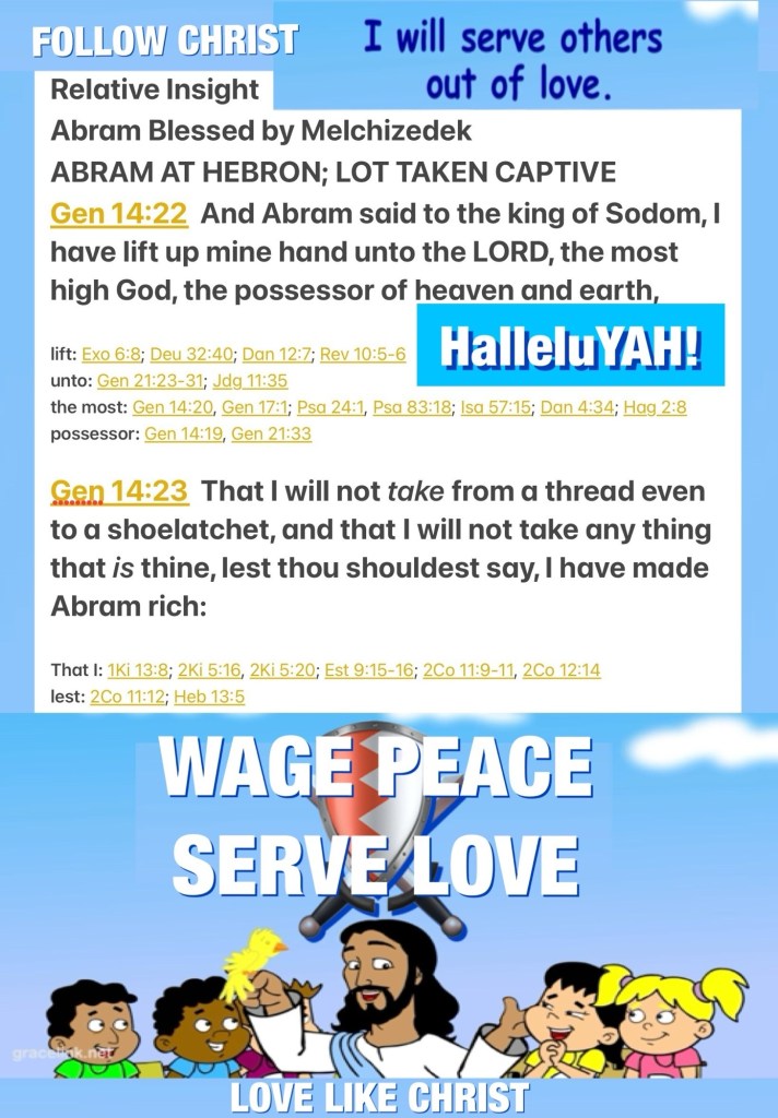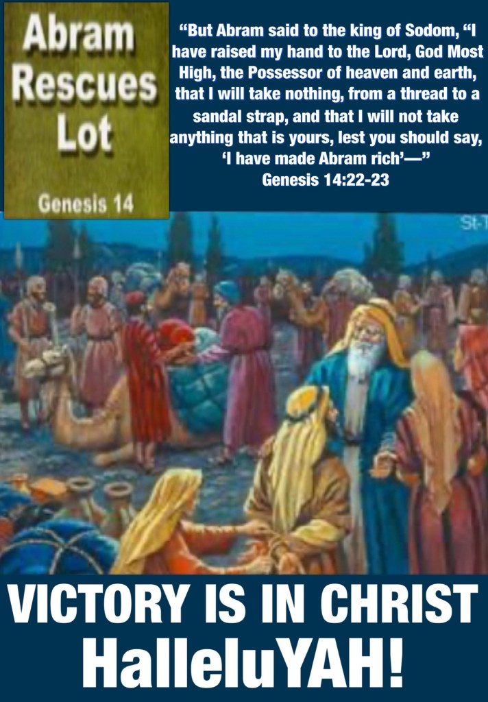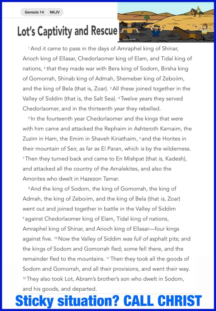 Children of THE MOST YAH ELOHIM Please remember father Abram whose example of physical intercession, intervention look a lot like what JESUS Would Do and Does 24/7 Daily because like Lot many of us have been Taken Captive or deceived into sin, it’s Almost Mission Impossible but Glory To YAH, He Also Came, Left us His WORD And HOLY SPIRIT And So Every Praise Is Due To GOD (In All 3 Persons) for Saving and Taking us out of every sticky situation! Please Hear His Voice today this earth is Not our Home. Receive CHRIST Now Repent BeLoved!