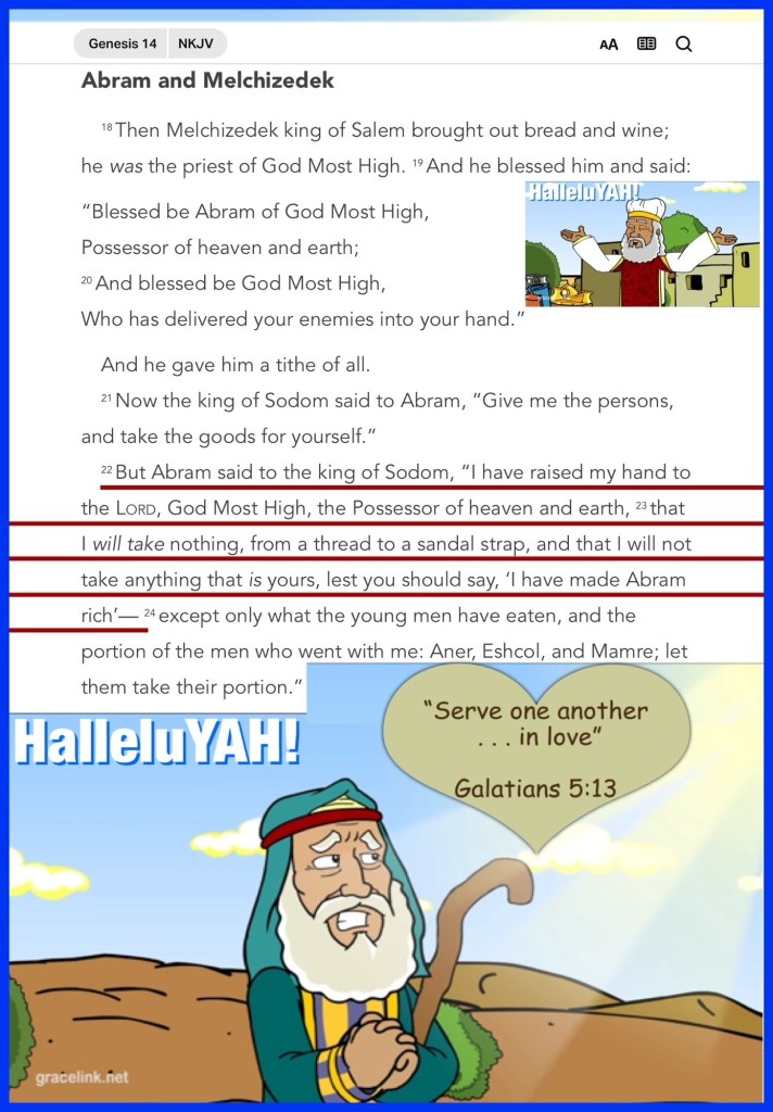 “But Abram said to the king of Sodom, “I have raised my hand to the Lord, God Most High, the Possessor of heaven and earth, that I will take nothing, from a thread to a sandal strap, and that I will not take anything that is yours, lest you should say, ‘I have made Abram rich’—” Genesis 14:22-23