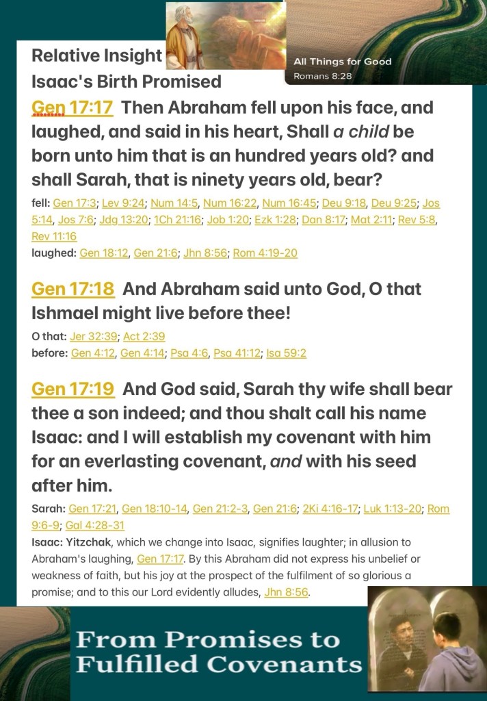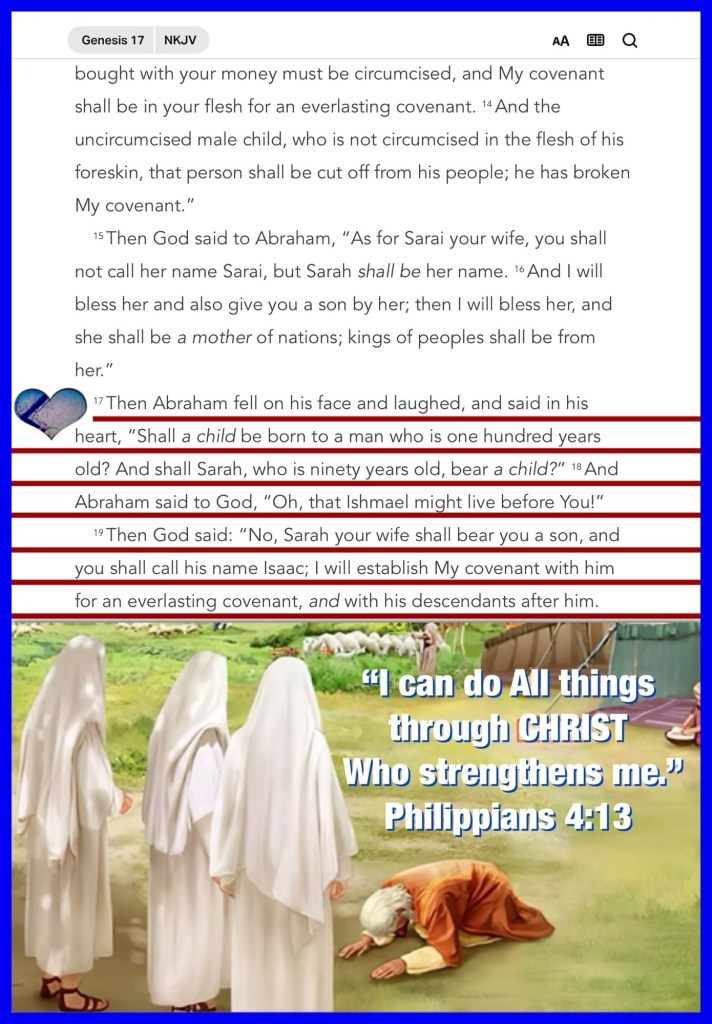 “Then Abraham fell on his face and laughed, and said in his heart, “Shall a child be born to a man who is one hundred years old? And shall Sarah, who is ninety years old, bear a child?” And Abraham said to God, “Oh, that Ishmael might live before You!” Then God said: “No, Sarah your wife shall bear you a son, and you shall call his name Isaac; I will establish My covenant with him for an everlasting covenant, and with his descendants after him.” Genesis 17:17-19