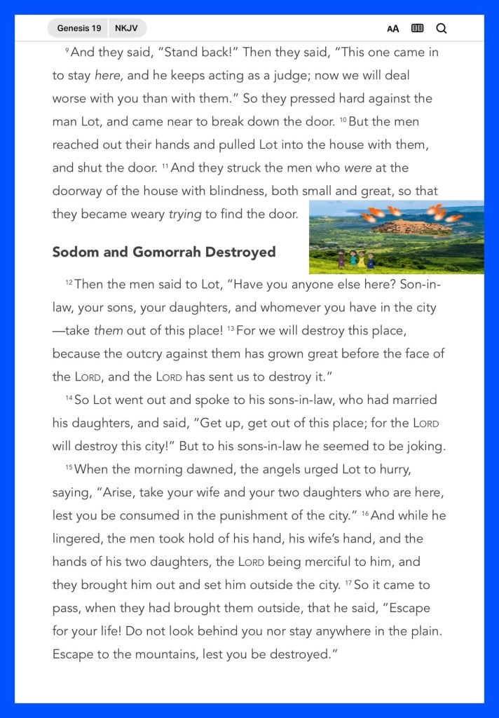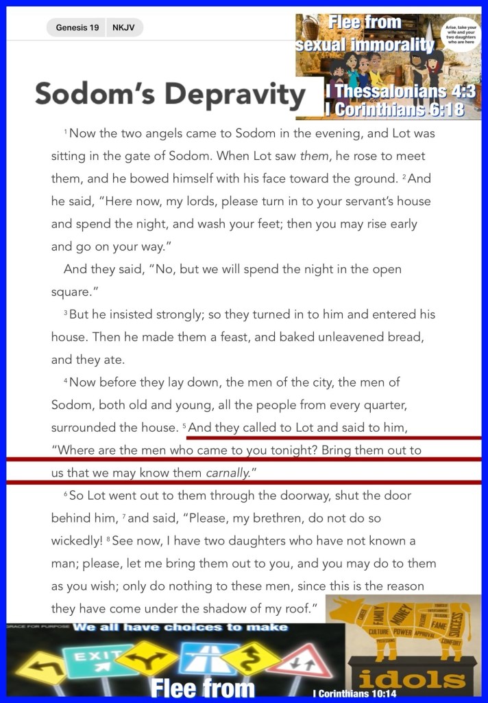 “And they called to Lot and said to him, “Where are the men who came to you tonight? Bring them out to us that we may know them carnally.”” Genesis 19:5 “Indeed now, your servant has found favor in your sight, and you have increased your mercy which you have shown me by saving my life; but I cannot escape to the mountains, lest some evil overtake me and I die.” Genesis 19:19 “It happened on the next day that the firstborn said to the younger, “Indeed I lay with my father last night; let us make him drink wine tonight also, and you go in and lie with him, that we may preserve the lineage of our father.” Thus both the daughters of Lot were with child by their father.” Genesis 19:34, 36