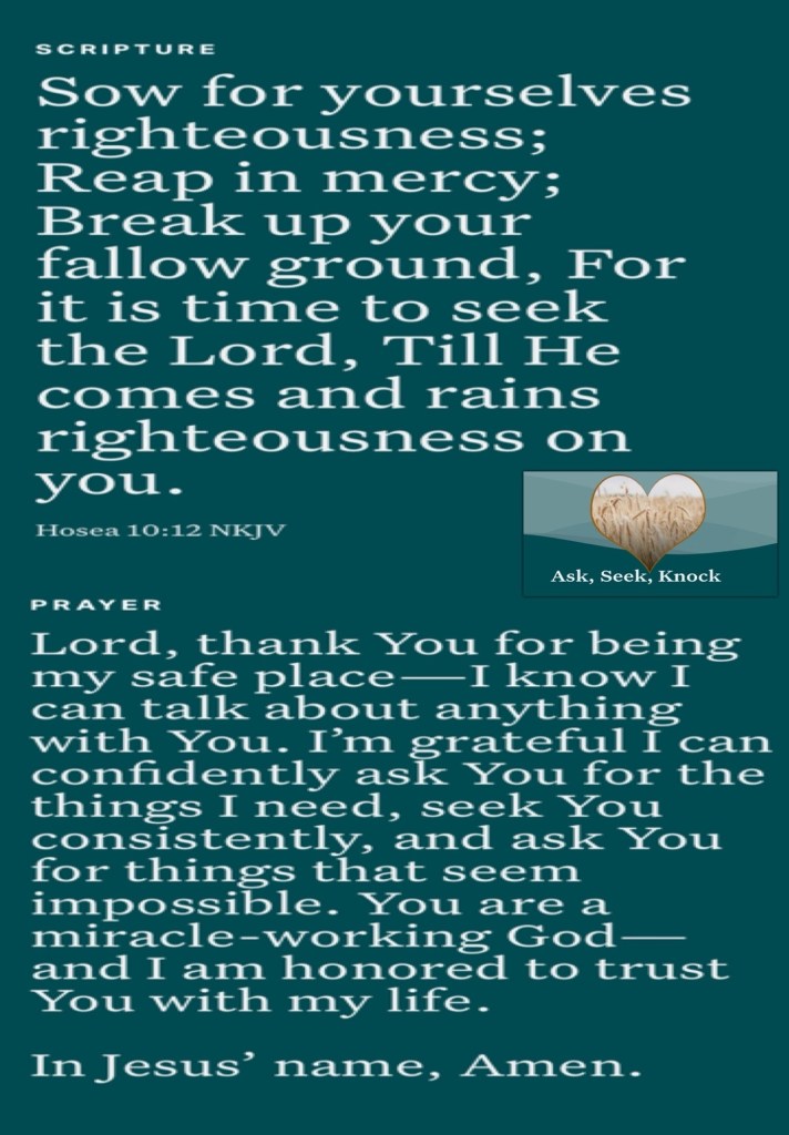Today’s study: Genesis 19, Today’s Verses: “You did not choose Me, but I chose you and appointed you that you should go and bear fruit, and that your fruit should remain, that whatever you ask the Father in My name He may give you.” John 15:16 “Sow for yourselves righteousness; Reap in mercy; Break up your fallow ground, For it is time to seek the Lord, Till He comes and rains righteousness on you.” Hosea 10:12