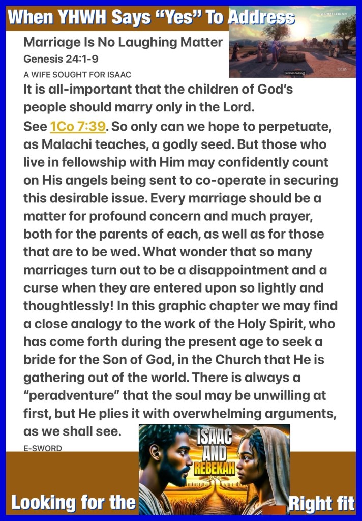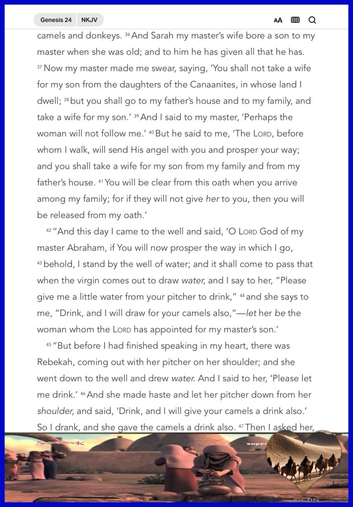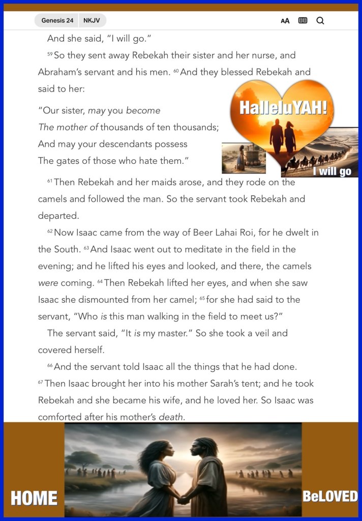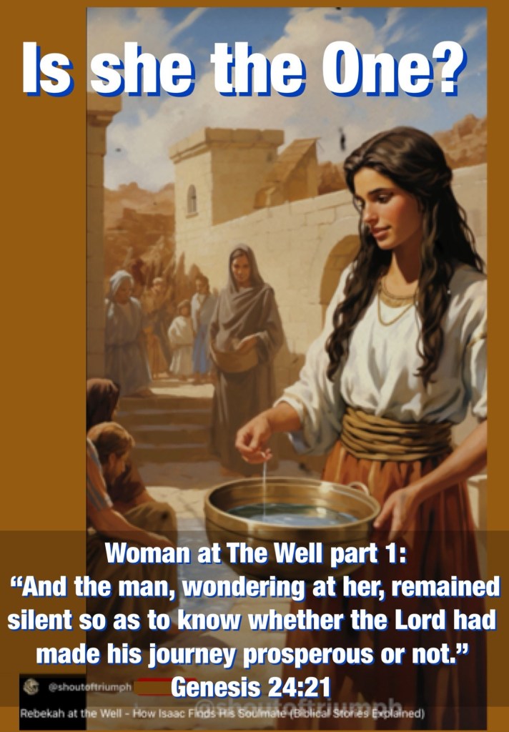 “The Lord God of heaven, who took me from my father’s house and from the land of my family, and who spoke to me and swore to me, saying, ‘To your descendants I give this land,’ He will send His angel before you, and you shall take a wife for my son from there.” Genesis 24:7 💕Woman at The Well part 1: “And the man, wondering at her, remained silent so as to know whether the Lord had made his journey prosperous or not.” Genesis 24:21 💞 When YHWH Says Yes To Address The Only Response Is Worship: “Then the man bowed down his head and worshiped the Lord.” Genesis 24:26 👑Glory Be To The Author Of TRUTH And LOVE “And I bowed my head and worshiped the Lord, and blessed the Lord God of my master Abraham, who had led me in the way of truth to take the daughter of my master’s brother for his son.” Genesis 24:48