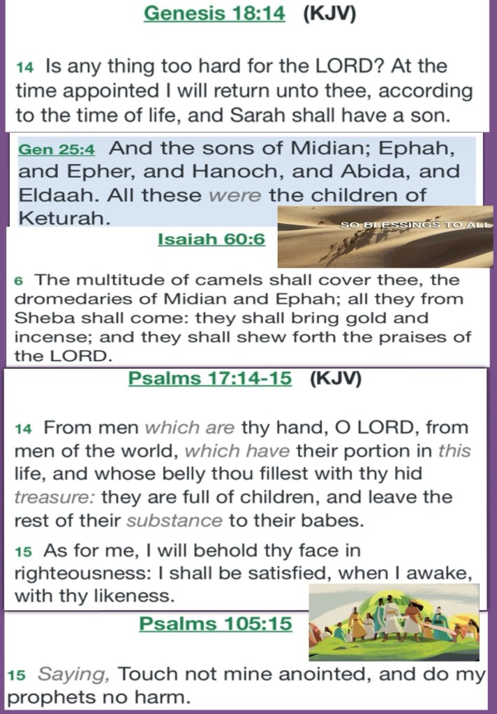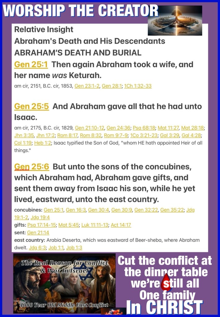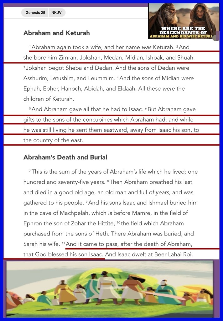 “Abraham again took a wife, and her name was Keturah. And she bore him Zimran, Jokshan, Medan, Midian, Ishbak, and Shuah. And Abraham gave all that he had to Isaac. But Abraham gave gifts to the sons of the concubines which Abraham had; and while he was still living he sent them eastward, away from Isaac his son, to the country of the east.” Genesis 25:1-2, 5-6