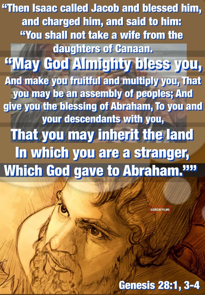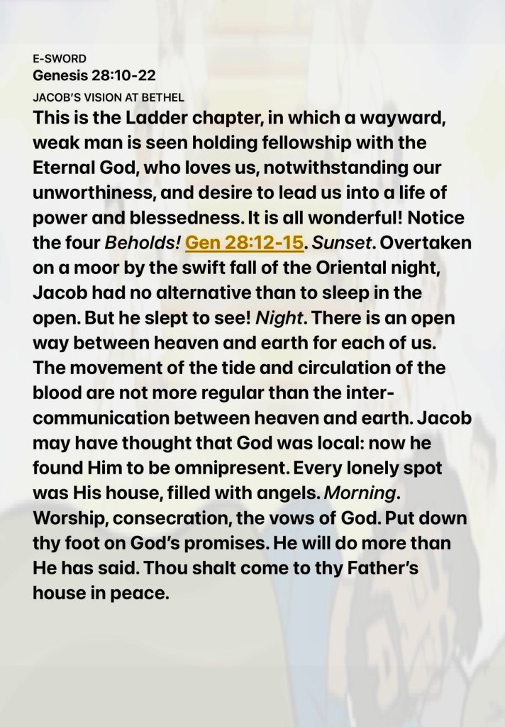 “So he came to a certain place and stayed there all night, because the sun had set. And he took one of the stones of that place and put it at his head, and he lay down in that place to sleep. Then he dreamed, and behold, a ladder was set up on the earth, and its top reached to heaven; and there the angels of God were ascending and descending on it. And behold, the Lord stood above it and said: “I am the Lord God of Abraham your father and the God of Isaac; the land on which you lie I will give to you and your descendants.” Genesis 28:11-13