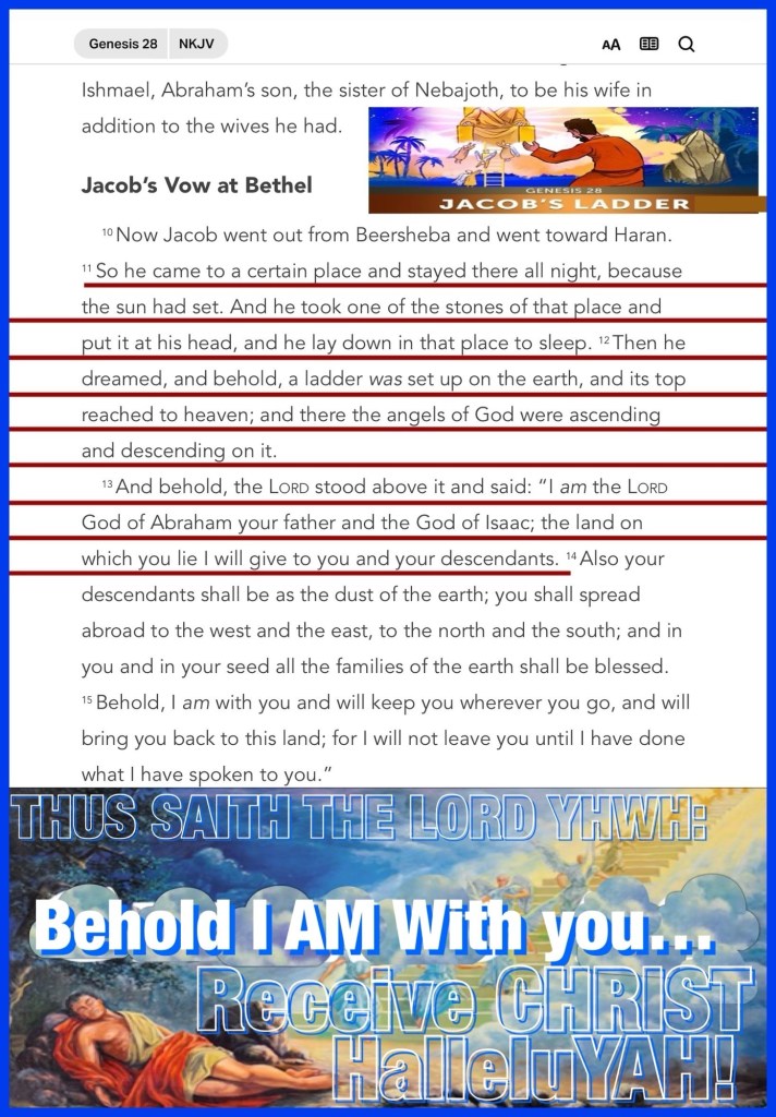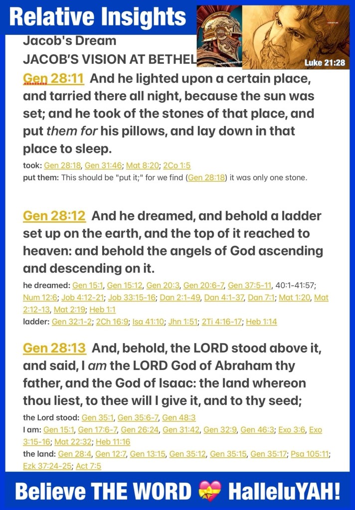 Are we so busy that GOD has to put us to sleep, just to get A Message Through? Let’s take a look in the life of one chosen child 😴 🛌 Dreaming Of Angels; in a Powerful Revelation Of YHWH GOD’S Glory And Salvation Plan. Today you may be going through a wilderness or valley (of the shadow of death) experience but know that YHWH GOD Is Present Active And Guiding you through, allow Him to Order your steps to Deliverance. JESUS CHRIST Is Coming Soon, Worship Is Warfare, we must get ready we must get our Minds Right (much of the battle will be fought in your mind or wherever you lay your head (even the affections of your heart) because we are a Temple for THE HOLY SPIRIT Of YAH to dwell) And Pray *note THE ROCK Jacob Rested his head on that he later Anoints Beth’EL because he met with YAH there, so Beautiful. HalleluYAH! GOD’S Got You BeLoved, have a great day and wonderful week pause often to hear what ELOHIM might be saying to you. I hope you enjoy today’s lesson Walk Good Be Blessed! 👑 Genesis 35:15 And Jacob called the name of the place where God spake with him, Bethel. (Bethel: i.e. the house of God)