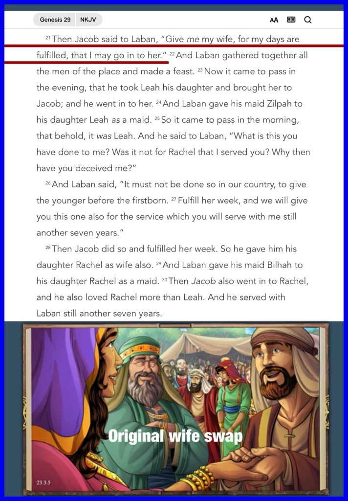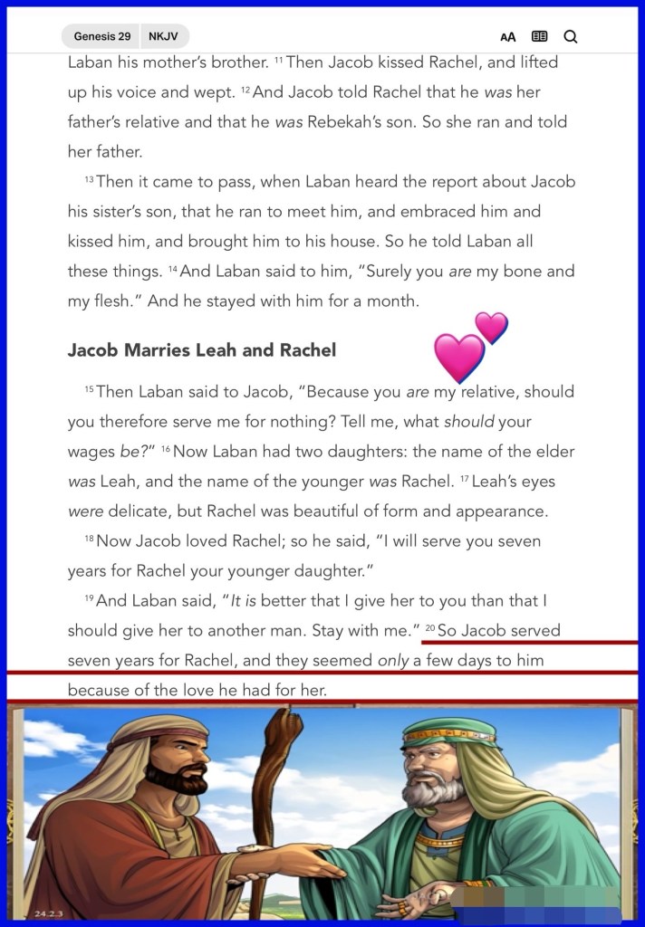 “So Jacob served seven years for Rachel, and they seemed only a few days to him because of the love he had for her.” “Then Jacob said to Laban, “Give me my wife, for my days are fulfilled, that I may go in to her.”” Genesis 29: 20-21
