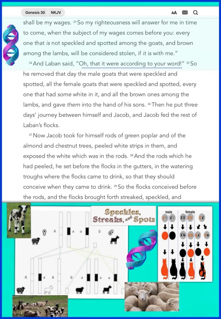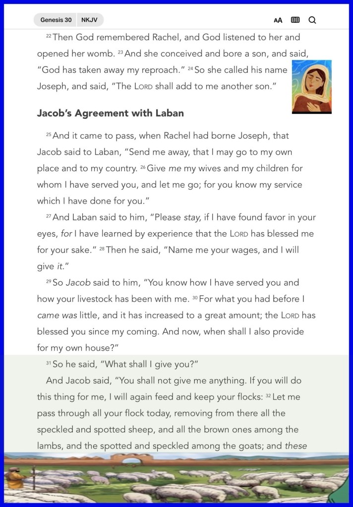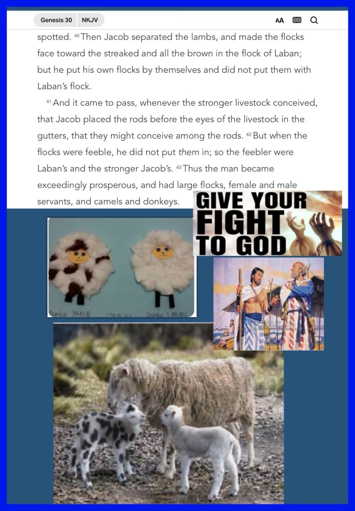 “So he said, “What shall I give you?” And Jacob said, “You shall not give me anything. If you will do this thing for me, I will again feed and keep your flocks: Let me pass through all your flock today, removing from there all the speckled and spotted sheep, and all the brown ones among the lambs, and the spotted and speckled among the goats; and these shall be my wages. So my righteousness will answer for me in time to come, when the subject of my wages comes before you: every one that is not speckled and spotted among the goats, and brown among the lambs, will be considered stolen, if it is with me.” And Laban said, “Oh, that it were according to your word!”” Genesis 30:31-34 NKJV