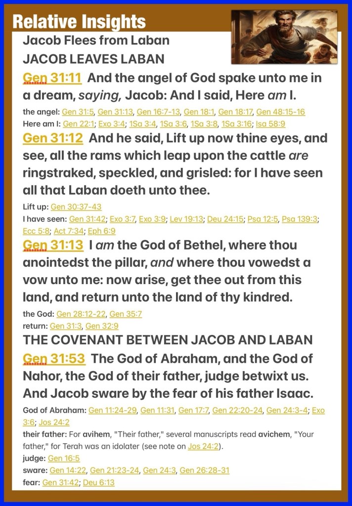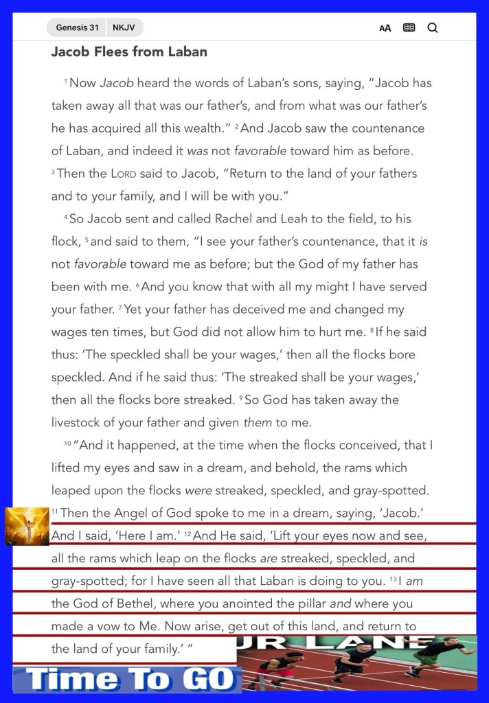 “Then the Angel of God spoke to me in a dream, saying, ‘Jacob.’ And I said, ‘Here I am.’ And He said, ‘Lift your eyes now and see, all the rams which leap on the flocks are streaked, speckled, and gray-spotted; for I have seen all that Laban is doing to you. I am the God of Bethel, where you anointed the pillar and where you made a vow to Me. Now arise, get out of this land, and return to the land of your family.’ ”” Genesis 31:11-13