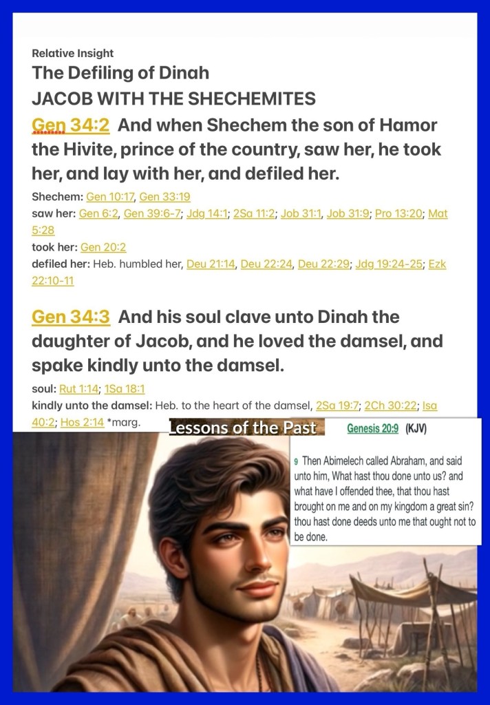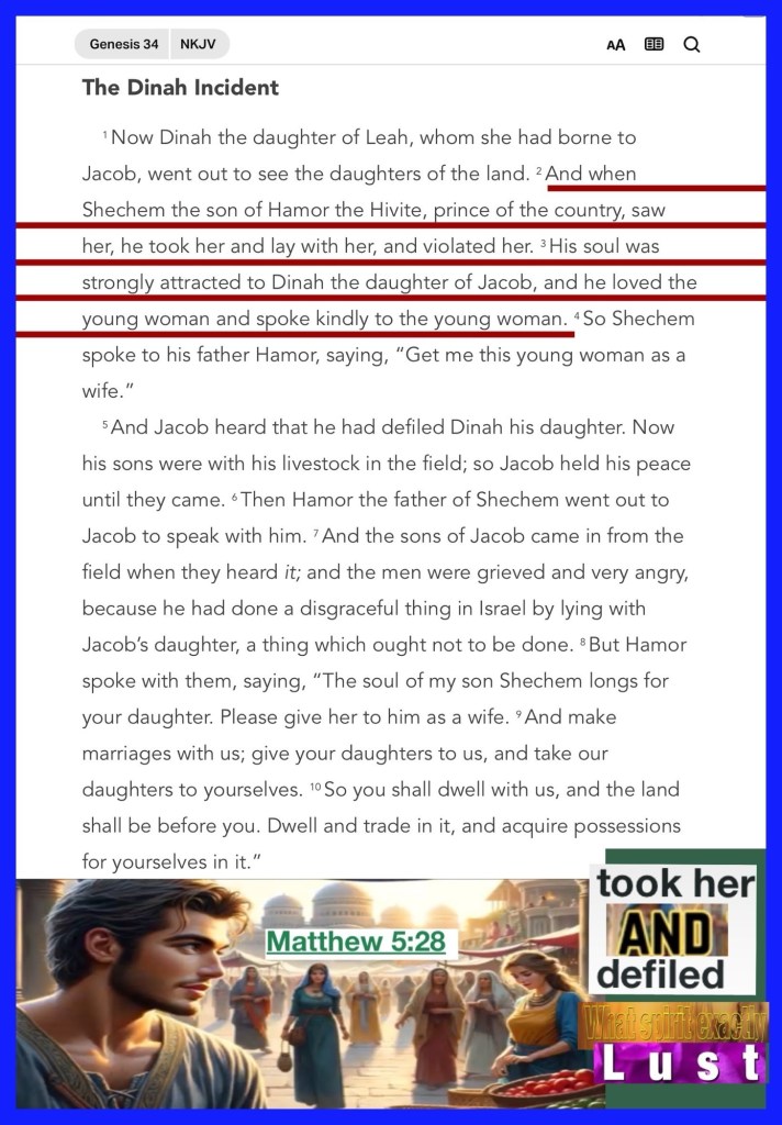 “And when Shechem the son of Hamor the Hivite, prince of the country, saw her, he took her and lay with her, and violated her. His soul was strongly attracted to Dinah the daughter of Jacob, and he loved the young woman and spoke kindly to the young woman.” Genesis 34:2-3