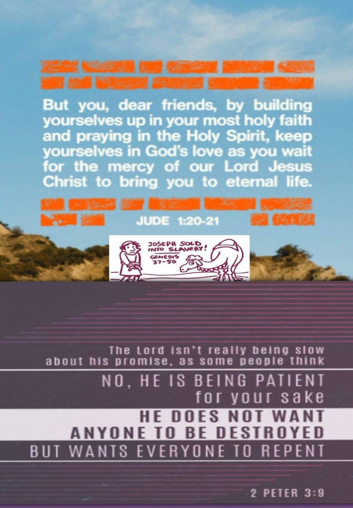 Today’s study: Genesis 37, Today’s Verses: “But you, beloved, building yourselves up on your most holy faith, praying in the Holy Spirit, keep yourselves in the love of God, looking for the mercy of our Lord Jesus Christ unto eternal life.” Jude 1:20-21 “The Lord is not slack concerning His promise, as some count slackness, but is longsuffering toward us, not willing that any should perish but that all should come to repentance.” II Peter 3:9