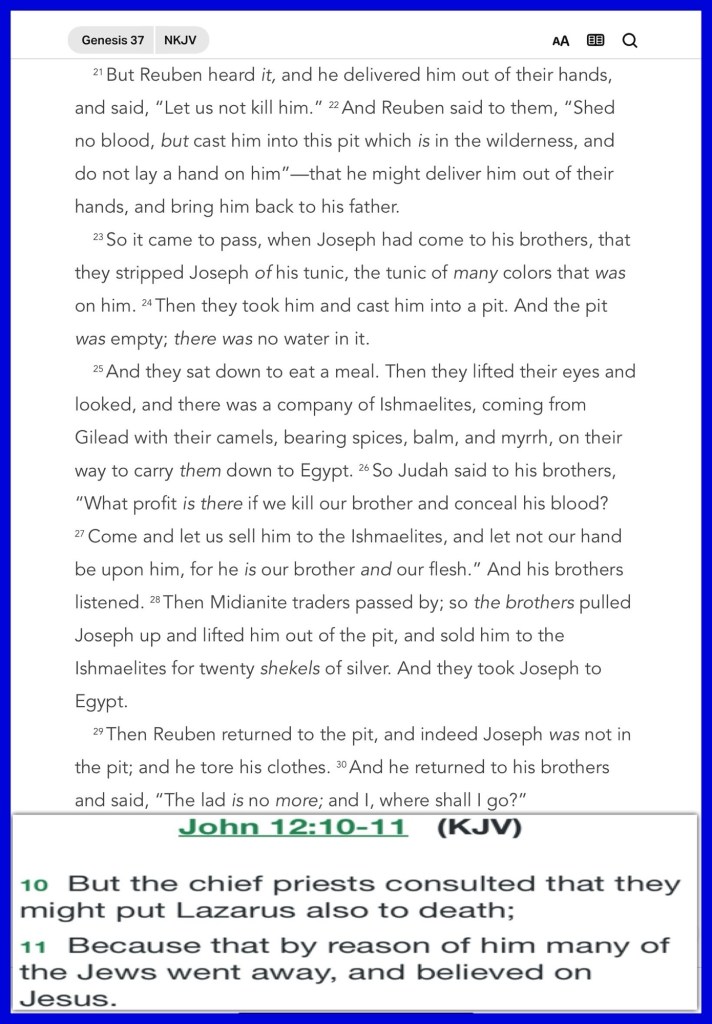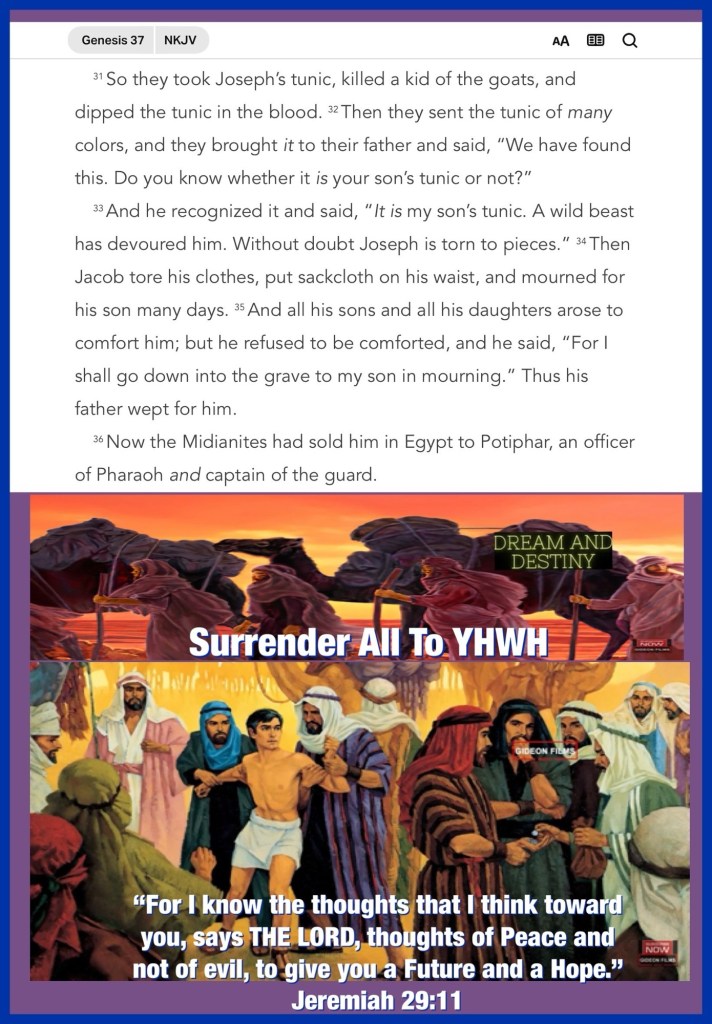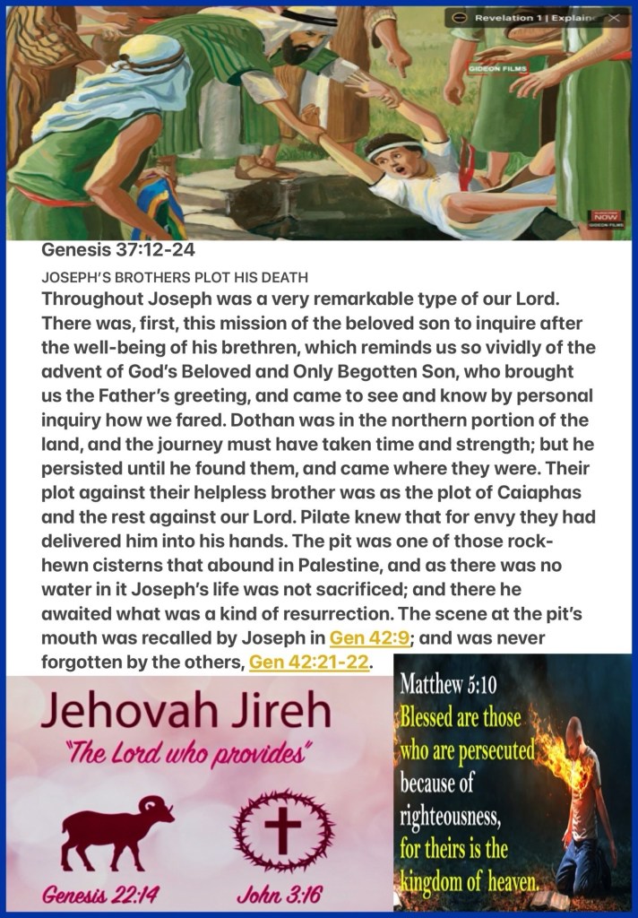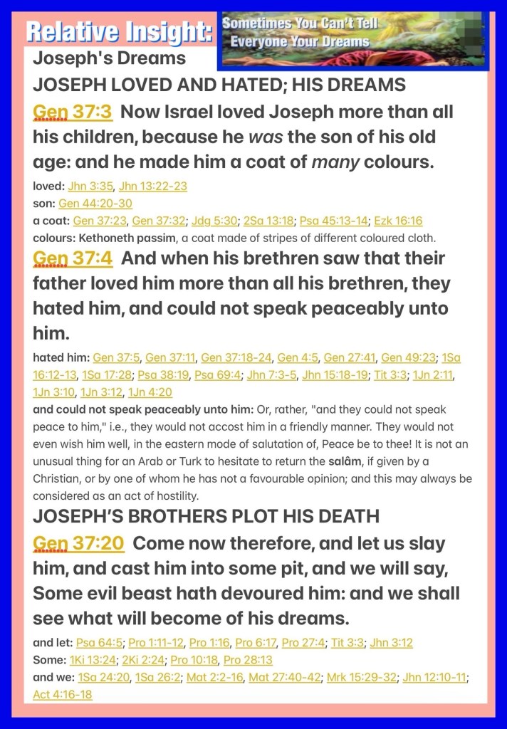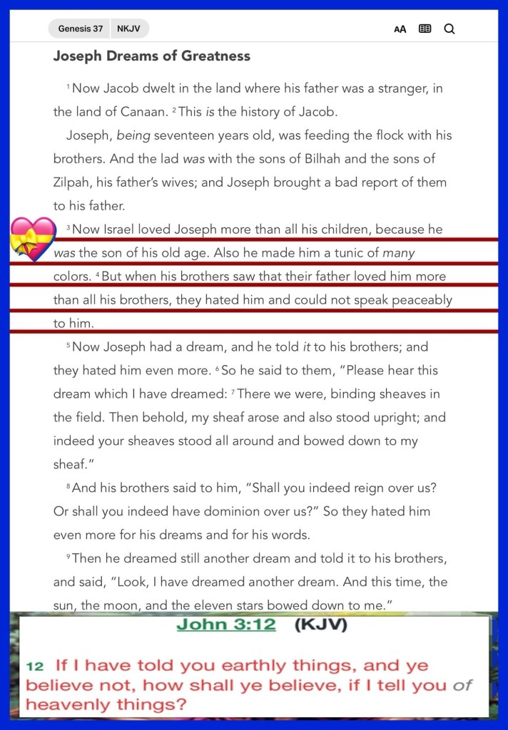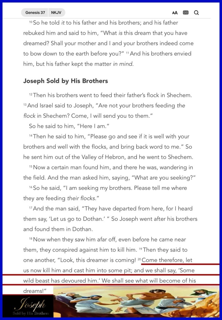 “Now Israel loved Joseph more than all his children, because he was the son of his old age. Also he made him a tunic of many colors. But when his brothers saw that their father loved him more than all his brothers, they hated him and could not speak peaceably to him.” 💘 “Come therefore, let us now kill him and cast him into some pit; and we shall say, ‘Some wild beast has devoured him.’ We shall see what will become of his dreams!”” Genesis 37:3-4, 20