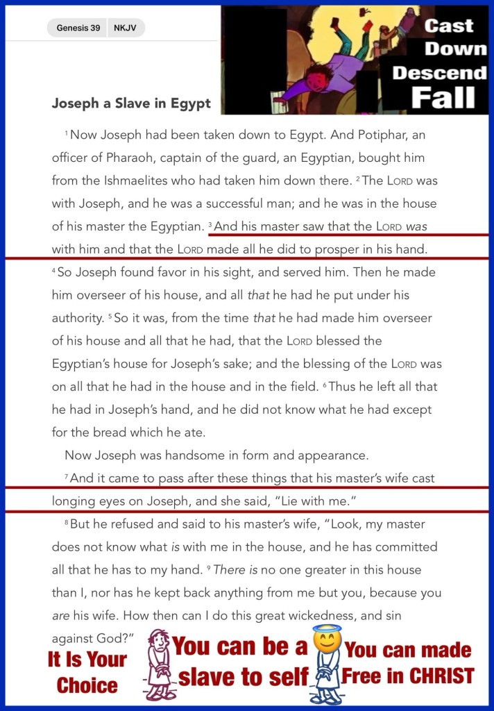 “And his master saw that the Lord was with him and that the Lord made all he did to prosper in his hand. And it came to pass after these things that his master’s wife cast longing eyes on Joseph, and she said, “Lie with me.”” Genesis 39:3, 7