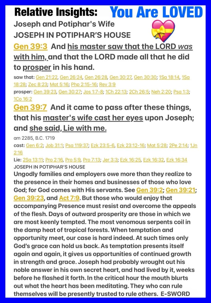 Joseph was a Real Man Of YAH, he had “Obvious Favor” he was clearly chosen and faithful even in the most horrific circumstances, he had No one Else but YAH The Critical Difference, he had a strong relationship and reliance on JEHOVAH JIRÈH Oh Yes BeLoved Sometimes Exercising FAITH Is Knowing When To Run, Thank You HOLY RUACH! Psalms 91:15 He shall call upon me, and I will answer him: I will be with him in trouble; I will deliver him, and honour him. HalleluYAH!