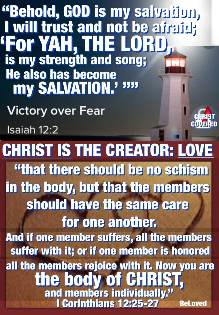 “Behold, GOD is my salvation, I will trust and not be afraid; ‘For YAH, THE LORD, is my strength and song; He also has become my SALVATION.’ ”” Isaiah 12:2 “that there should be no schism in the body, but that the members should have the same care for one another. And if one member suffers, all the members suffer with it; or if one member is honored, all the members rejoice with it. Now you are the body of Christ, and members individually.” I Corinthians 12:25-27