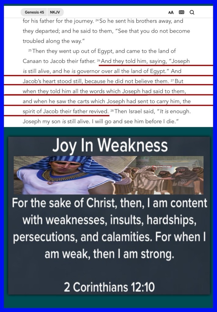 Today’s study: Genesis 45, Today’s Verses: “Therefore I take pleasure in infirmities, in reproaches, in needs, in persecutions, in distresses, for Christ’s sake. For when I am weak, then I am strong.” II Corinthians 12:10 “Therefore be imitators of God as dear children. And walk in love, as Christ also has loved us and given Himself for us, an offering and a sacrifice to God for a sweet-smelling aroma.” Ephesians 5:1-2