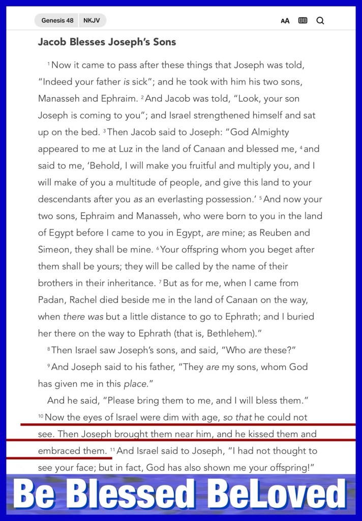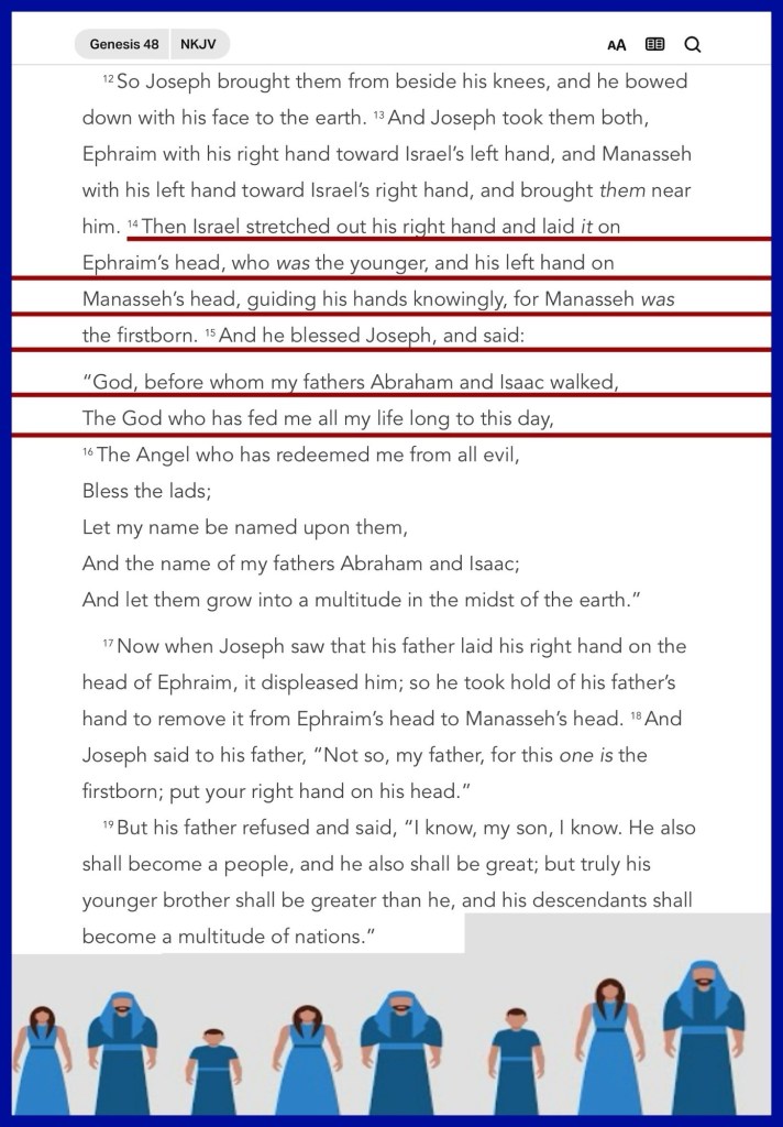 “Now the eyes of Israel were dim with age, so that he could not see. Then Joseph brought them near him, and he kissed them and embraced them. Then Israel stretched out his right hand and laid it on Ephraim’s head, who was the younger, and his left hand on Manasseh’s head, guiding his hands knowingly, for Manasseh was the firstborn. And he blessed Joseph, and said: “God, before whom my fathers Abraham and Isaac walked, The God who has fed me all my life long to this day,”Genesis 48:10, 14-15