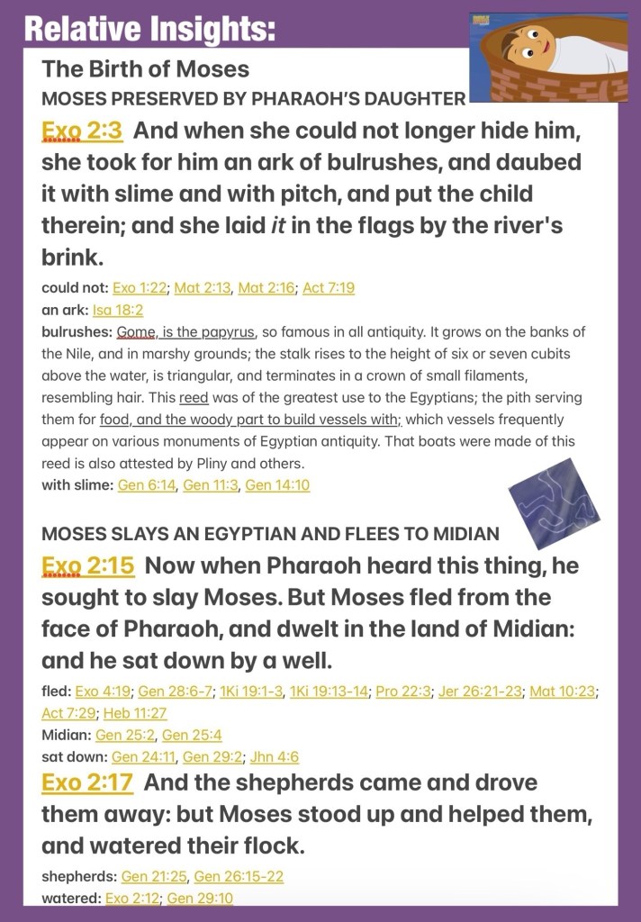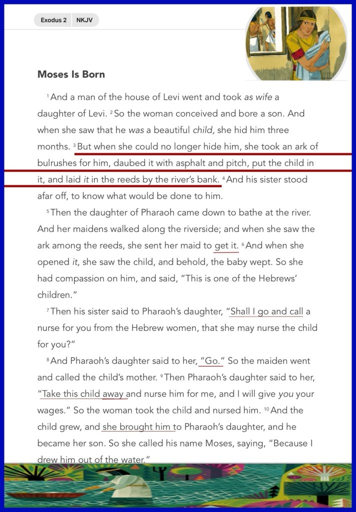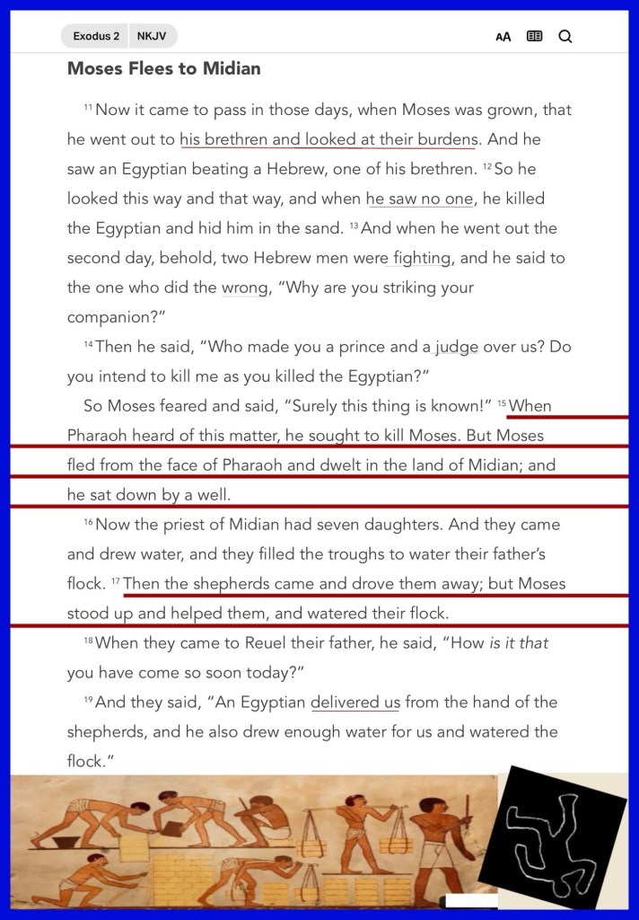 “But when she could no longer hide him, she took an ark of bulrushes for him, daubed it with asphalt and pitch, put the child in it, and laid it in the reeds by the river’s bank.”… “When Pharaoh heard of this matter, he sought to kill Moses. But Moses fled from the face of Pharaoh and dwelt in the land of Midian; and he sat down by a well.”…“Then the shepherds came and drove them away; but Moses stood up and helped them, and watered their flock.” Exodus 2:3,15,17