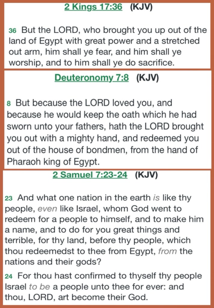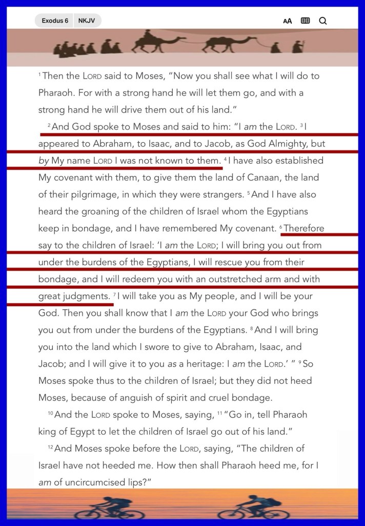 “And God spoke to Moses and said to him: “I am the Lord. Therefore say to the children of Israel: ‘I am the Lord; I will bring you out from under the burdens of the Egyptians, I will rescue you from their bondage, and I will redeem you with an outstretched arm and with great judgments. I will take you as My people, and I will be your God. Then you shall know that I am the Lord your God who brings you out from under the burdens of the Egyptians.” Exodus 6:2, 6-7