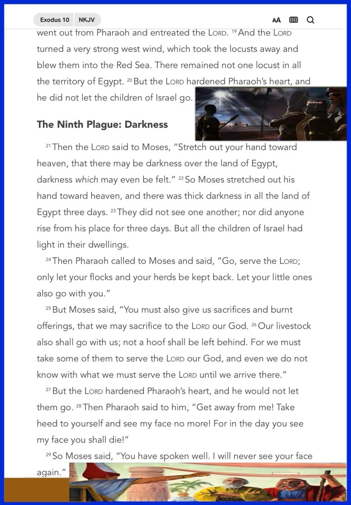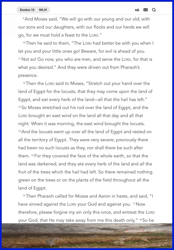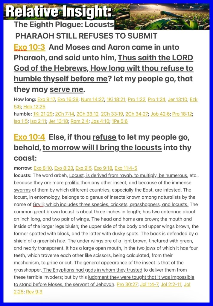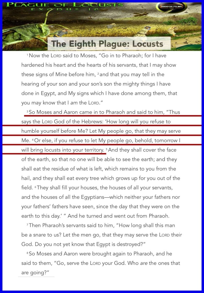 “So Moses and Aaron came in to Pharaoh and said to him, “Thus says the Lord God of the Hebrews: ‘How long will you refuse to humble yourself before Me? Let My people go, that they may serve Me. Or else, if you refuse to let My people go, behold, tomorrow I will bring locusts into your territory.” Exodus 10:3-4