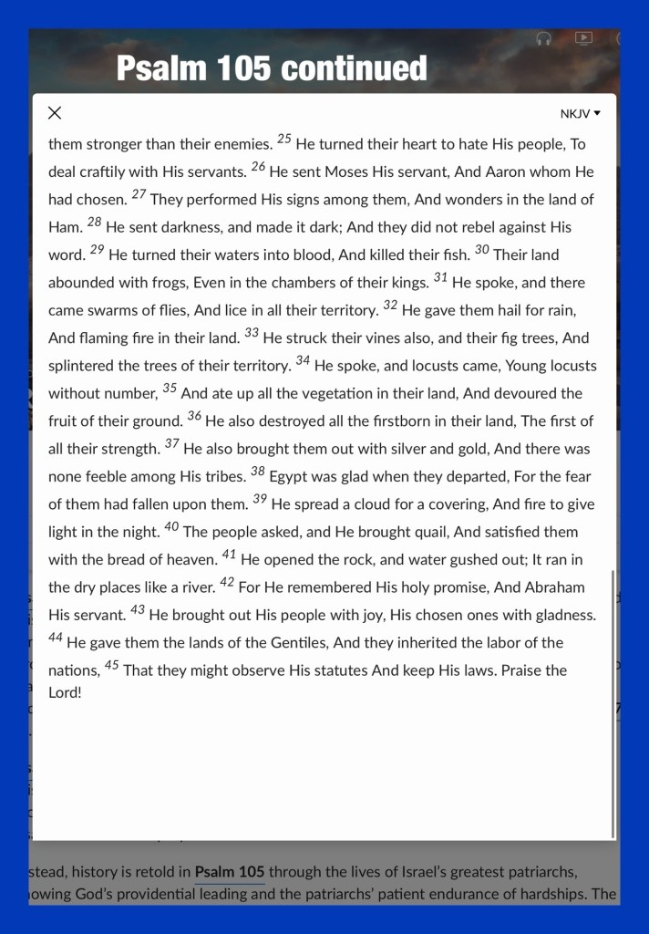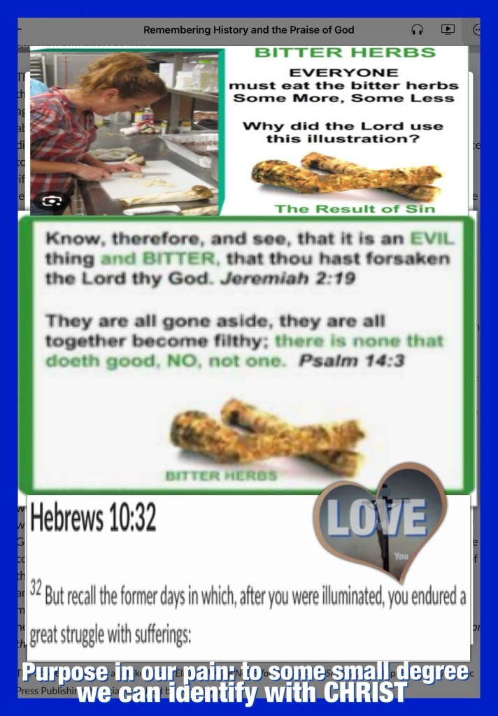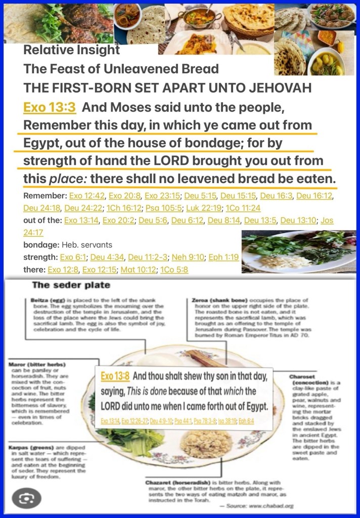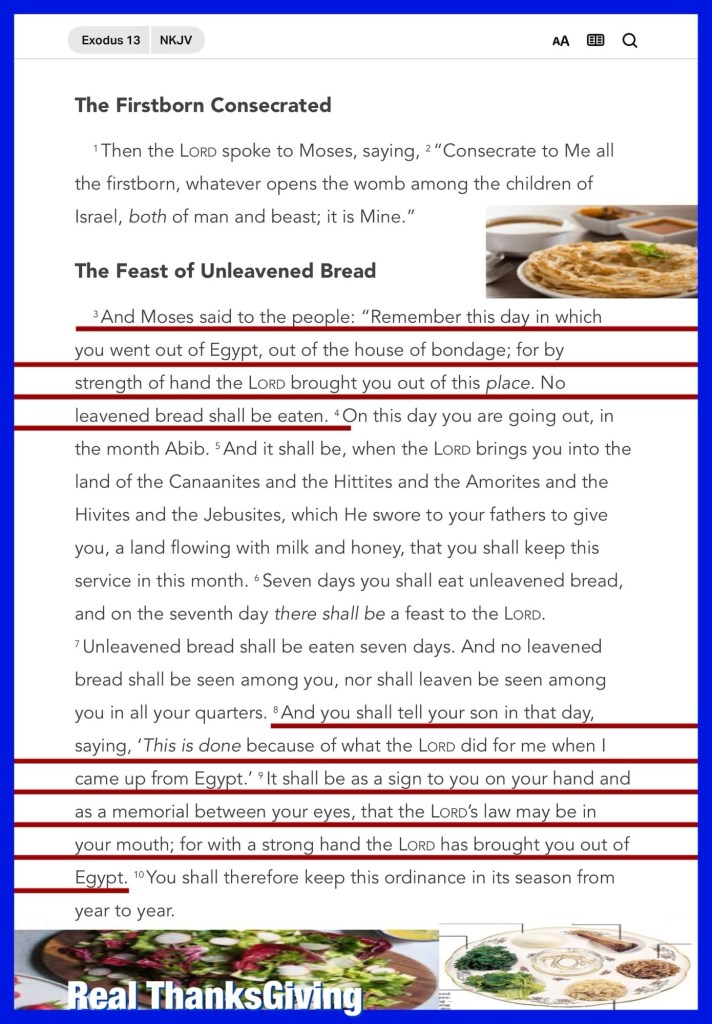 “And Moses said to the people: “Remember this day in which you went out of Egypt, out of the house of bondage; for by strength of hand the Lord brought you out of this place. No leavened bread shall be eaten. And you shall tell your son in that day, saying, ‘This is done because of what the Lord did for me when I came up from Egypt.’ It shall be as a sign to you on your hand and as a memorial between your eyes, that the Lord’s law may be in your mouth; for with a strong hand the Lord has brought you out of Egypt.” Exodus 13:3, 8-9