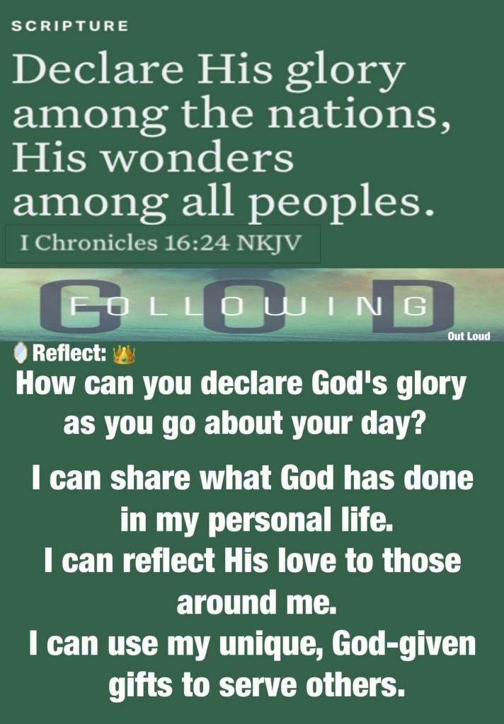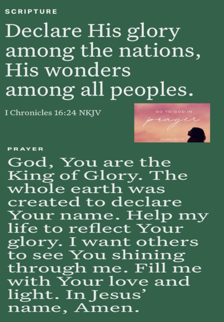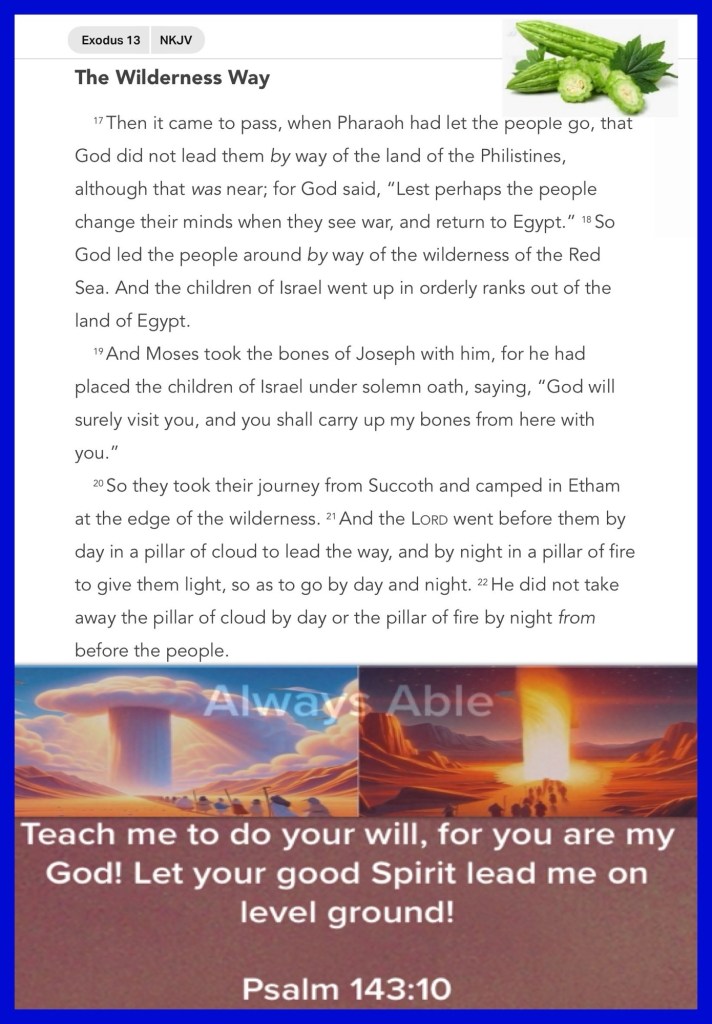 Today’s message Exodus 13, today’s verses: “Teach me to do Your will, For You are my God; Your Spirit is good. Lead me in the land of uprightness.” Psalms 143:10 “Declare His glory among the nations, His wonders among all peoples.” I Chronicles 16:24