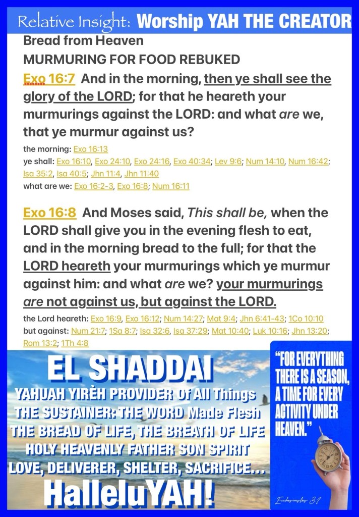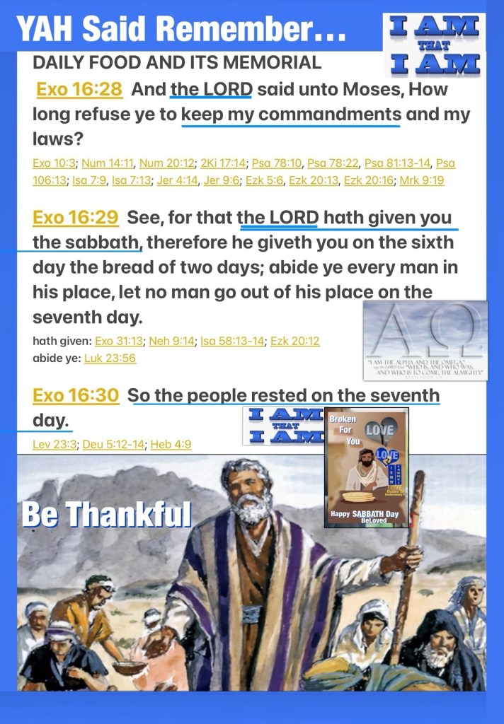 Please consider this BeLoved: There’s Not A Need we have That YAH Has Not Supplied, or Isn’t Aware of, Thanksgiving Is an Act of Worship (the opposite is true in another direction) Take Seriously THE WORD OF GOD, He Is our DAILY FOOD AND ITS MEMORIAL 🔍 Remember CREATION —-> SABBATH —-> WORSHIP our FATHER THE CREATOR!