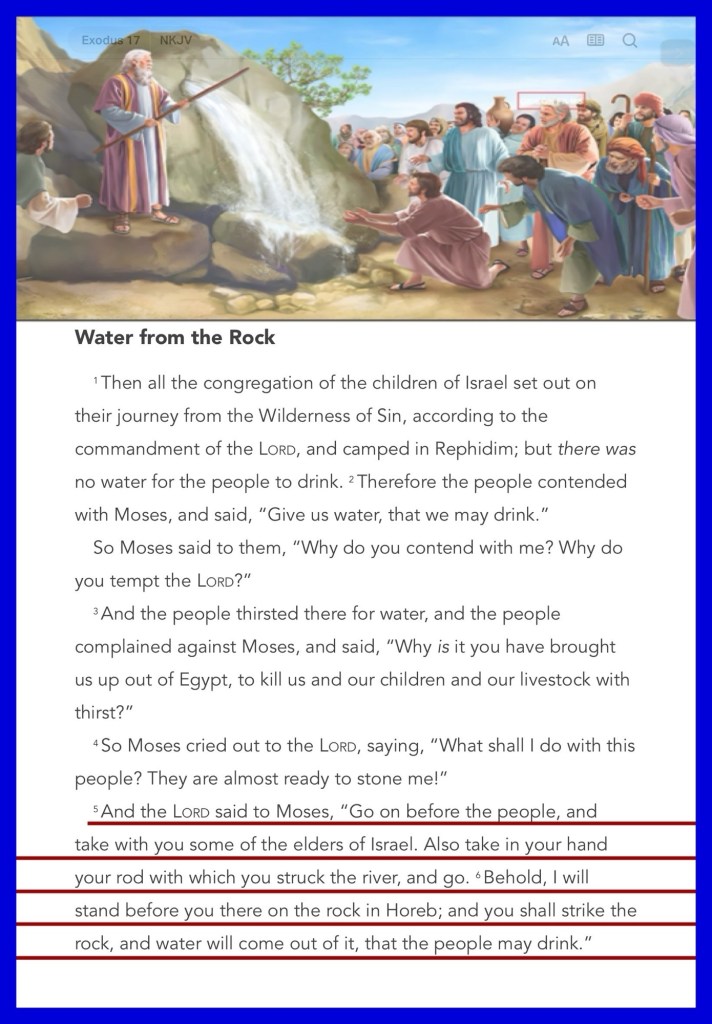 “And the Lord said to Moses, “Go on before the people, and take with you some of the elders of Israel. Also take in your hand your rod with which you struck the river, and go. Behold, I will stand before you there on the rock in Horeb; and you shall strike the rock, and water will come out of it, that the people may drink.” And Moses did so in the sight of the elders of Israel.” Exodus 17:5-6