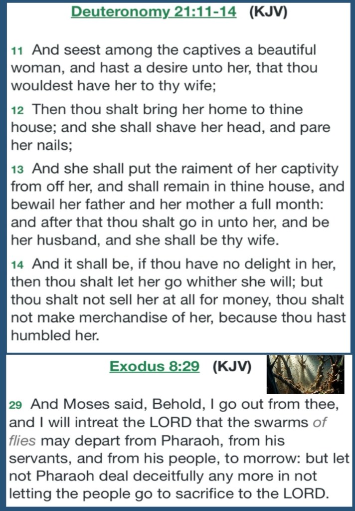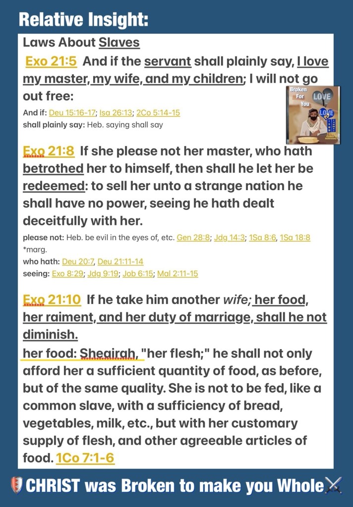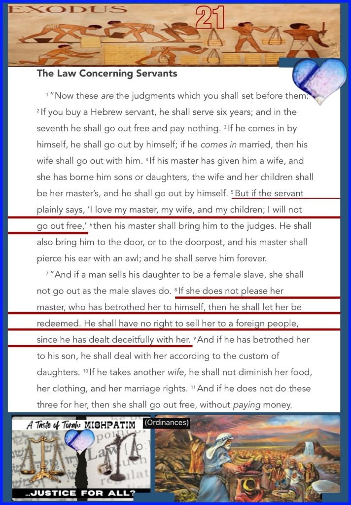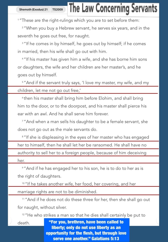 “But if the servant plainly says, ‘I love my master, my wife, and my children; I will not go out free,’” Exodus 21:5 “If she does not please her master, who has betrothed her to himself, then he shall let her be redeemed. He shall have no right to sell her to a foreign people, since he has dealt deceitfully with her. …If he takes another wife, he shall not diminish her food, her clothing, and her marriage rights.” Exodus 21:8, 10