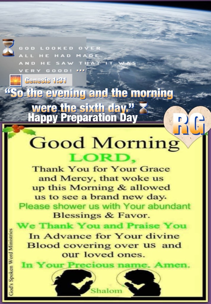 Happy Preparation Day Greetings BeLoved child of YHWH 🌅 sunset starts The Sabbath as established by our CREATOR GOD (*please see Genesis 1-2, Exodus 20, Deuteronomy 5) “Then God saw everything that He had made, and indeed it was very good. So the evening and the morning were the sixth day.” Genesis 1:31 “Thus the heavens and the earth were completed, and all their array. And in the seventh day Elohim completed His work which He had done, and He rested on the seventh day from all His work which He had made. And Elohim blessed the seventh day and set it apart, because on it He rested from all His work which Elohim in creating had made.” Berĕshith (Genesis) 2:1-3 TS2009 (You Are LOVED Beyond Measure… Love and BeLoved HalleluYAH!)