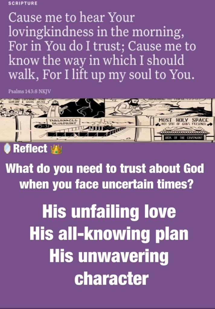 Today’s lesson Exodus 24, today’s verses: “But each one is tempted when he is drawn away by his own desires and enticed. Then, when desire has conceived, it gives birth to sin; and sin, when it is full-grown, brings forth death.” James 1:14-15 “Cause me to hear Your lovingkindness in the morning, For in You do I trust; Cause me to know the way in which I should walk, For I lift up my soul to You.” Psalms 143:8