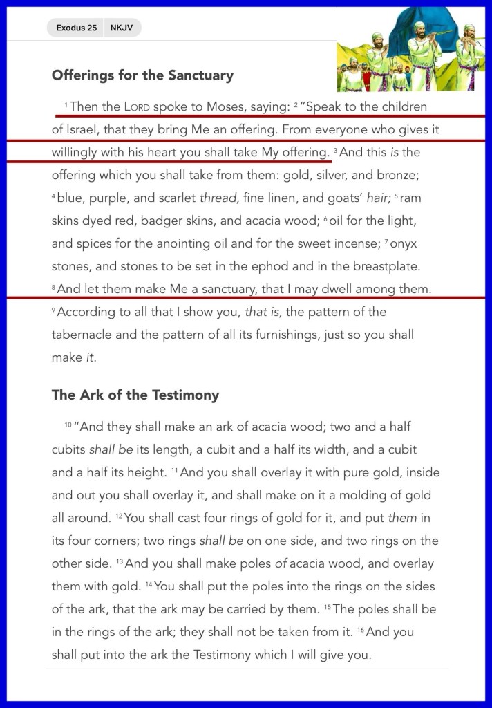 “Then the Lord spoke to Moses, saying: “Speak to the children of Israel, that they bring Me an offering. From everyone who gives it willingly with his heart you shall take My offering. And let them make Me a sanctuary, that I may dwell among them.” Exodus 25:1-2, 8
