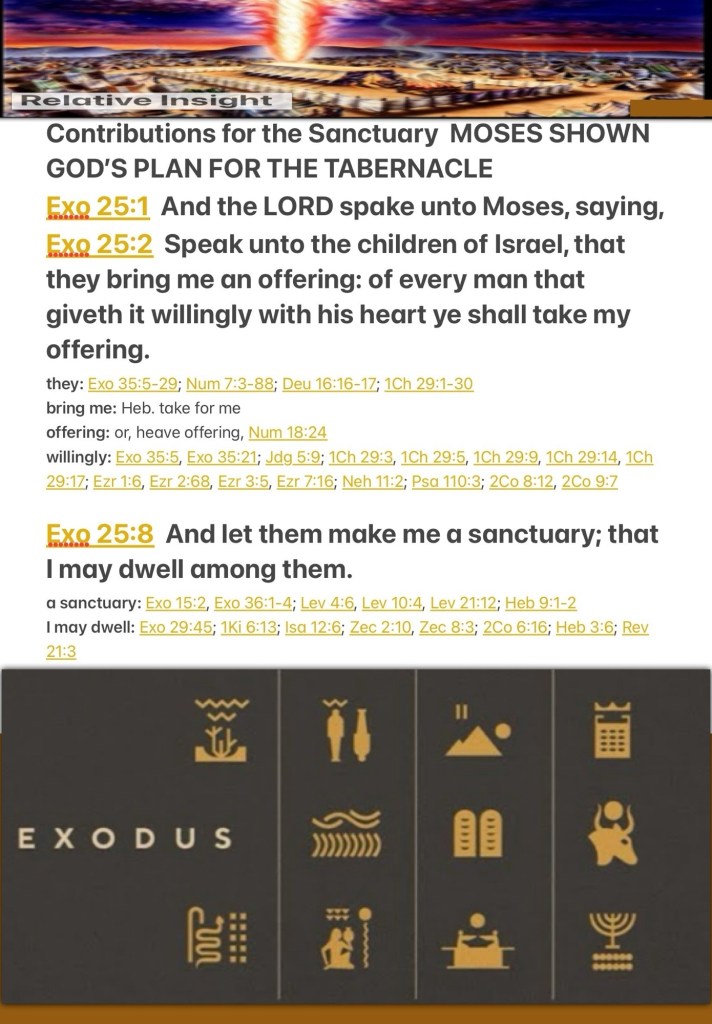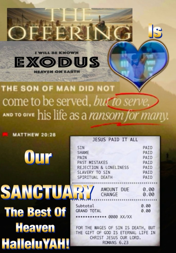 Happy Sabbath BeLoved, Thank you for journeying with me through our FATHER’S SCRIPTURE Today’s Focus THE OFFERING THE SANCTUARY; THE GREATEST OFFERING CHRIST, THE SANCTUARY The Place we meet with GOD HALLELUYAH! Be Blessed Covered and Well Loved! Walk Good Worship THE CREATOR YHWH GOD.