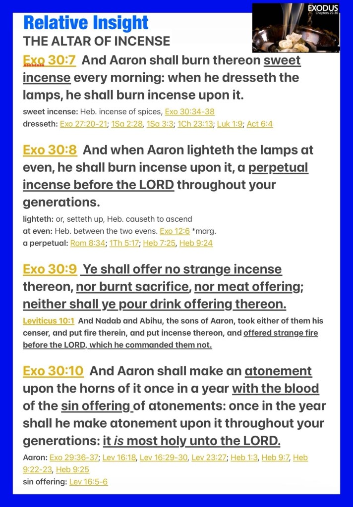 ““Aaron shall burn on it sweet incense every morning; when he tends the lamps, he shall burn incense on it. And when Aaron lights the lamps at twilight, he shall burn incense on it, a perpetual incense before the Lord throughout your generations. You shall not offer strange incense on it, or a burnt offering, or a grain offering; nor shall you pour a drink offering on it. And Aaron shall make atonement upon its horns once a year with the blood of the sin offering of atonement; once a year he shall make atonement upon it throughout your generations. It is most holy to the Lord.”” Exodus 30:7-10