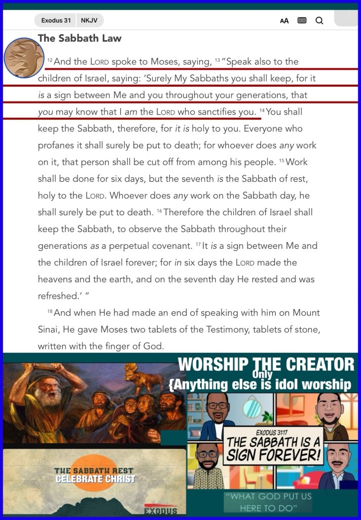 “And the Lord spoke to Moses, saying, “Speak also to the children of Israel, saying: ‘Surely My Sabbaths you shall keep, for it is a sign between Me and you throughout your generations, that you may know that I am the Lord who sanctifies you.” Exodus 31:12-13
